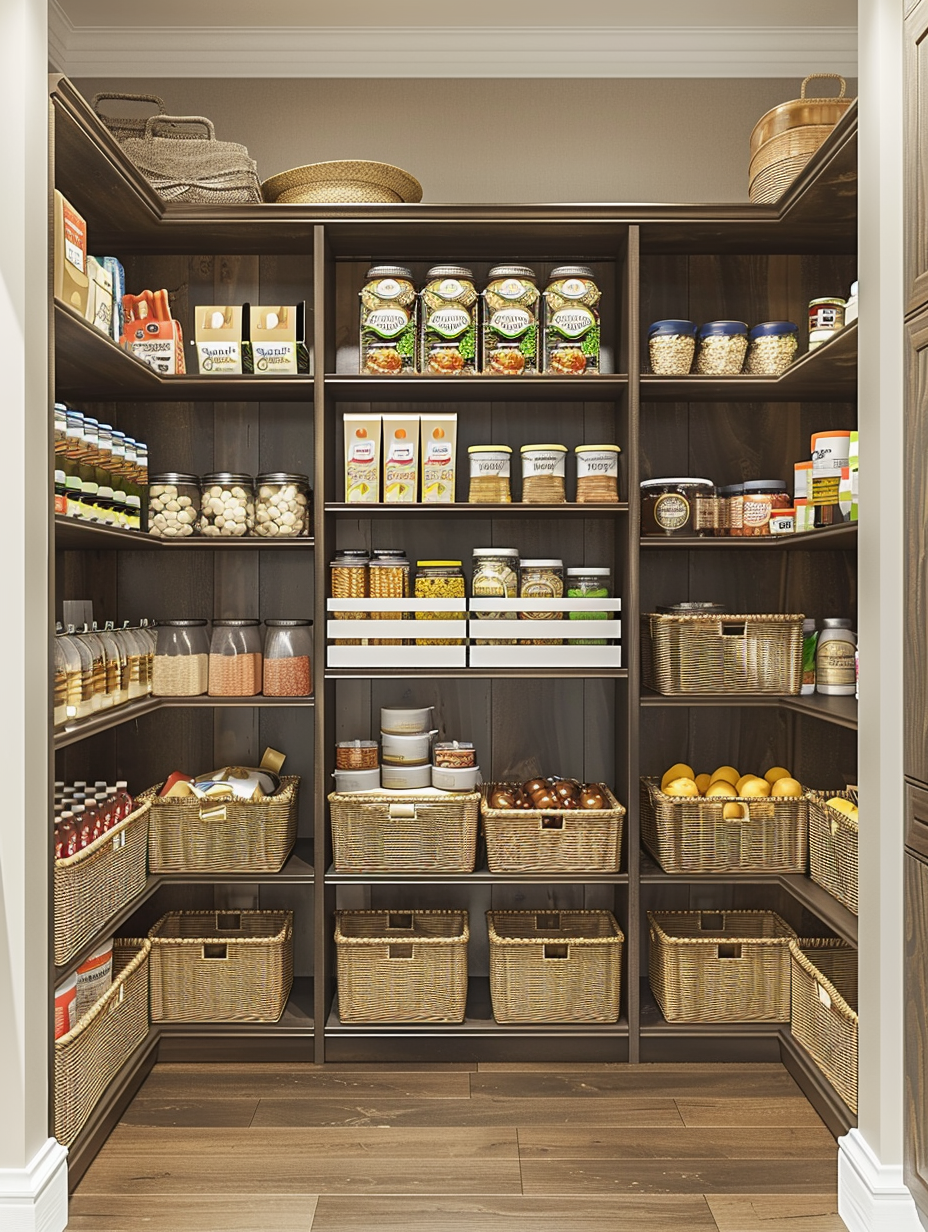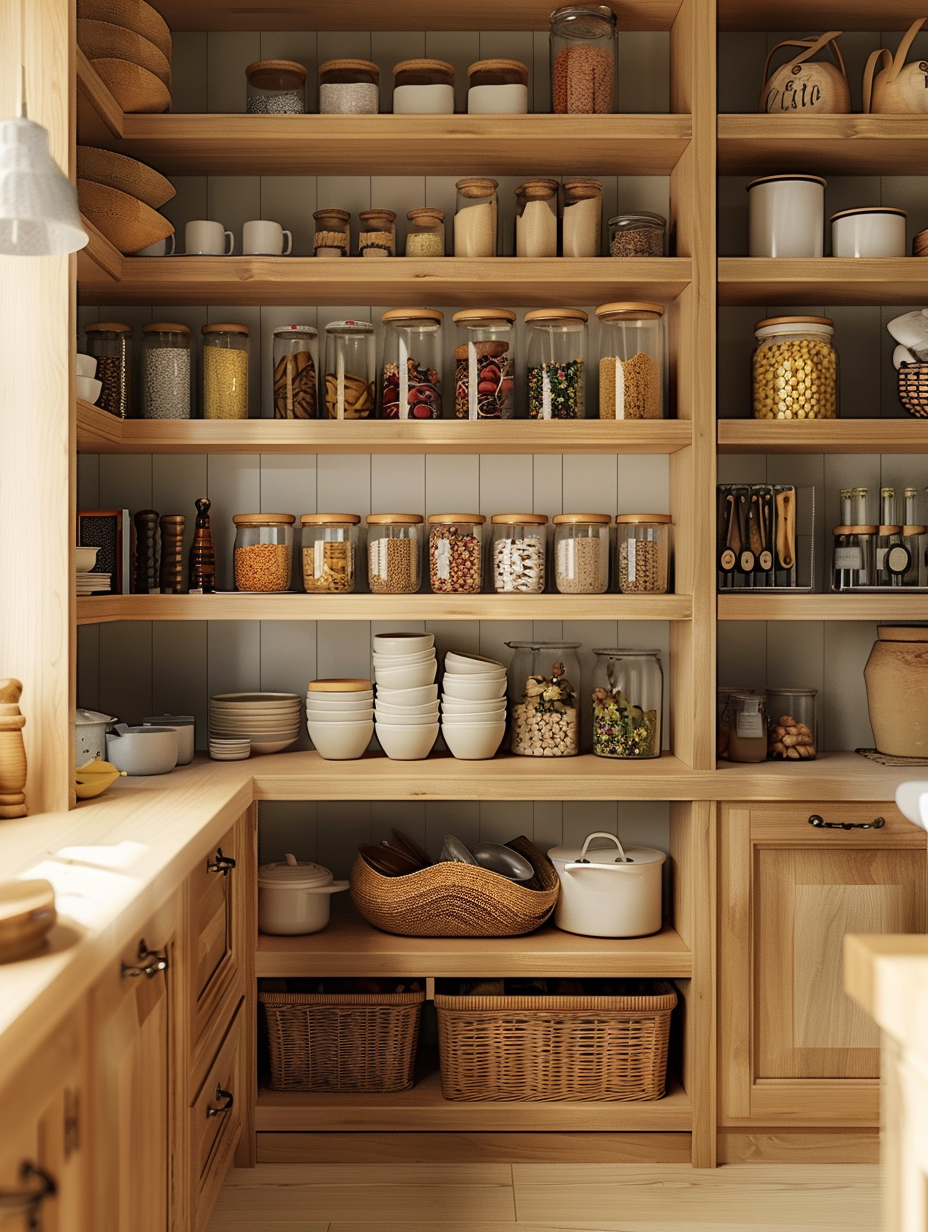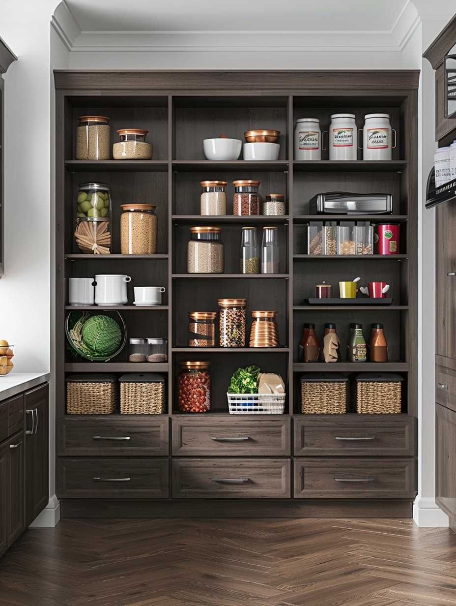Shelving with integrated baskets, in fact, blends open shelving and the usefulness of pull-out baskets. These bins are solid for putting collectively fleeting stuffs like snacks, produce, or kitchen linens on shelves. Built-in baskets are useful in making your pantry a clean, neat place that is also easily accessed for removing frequently used items.