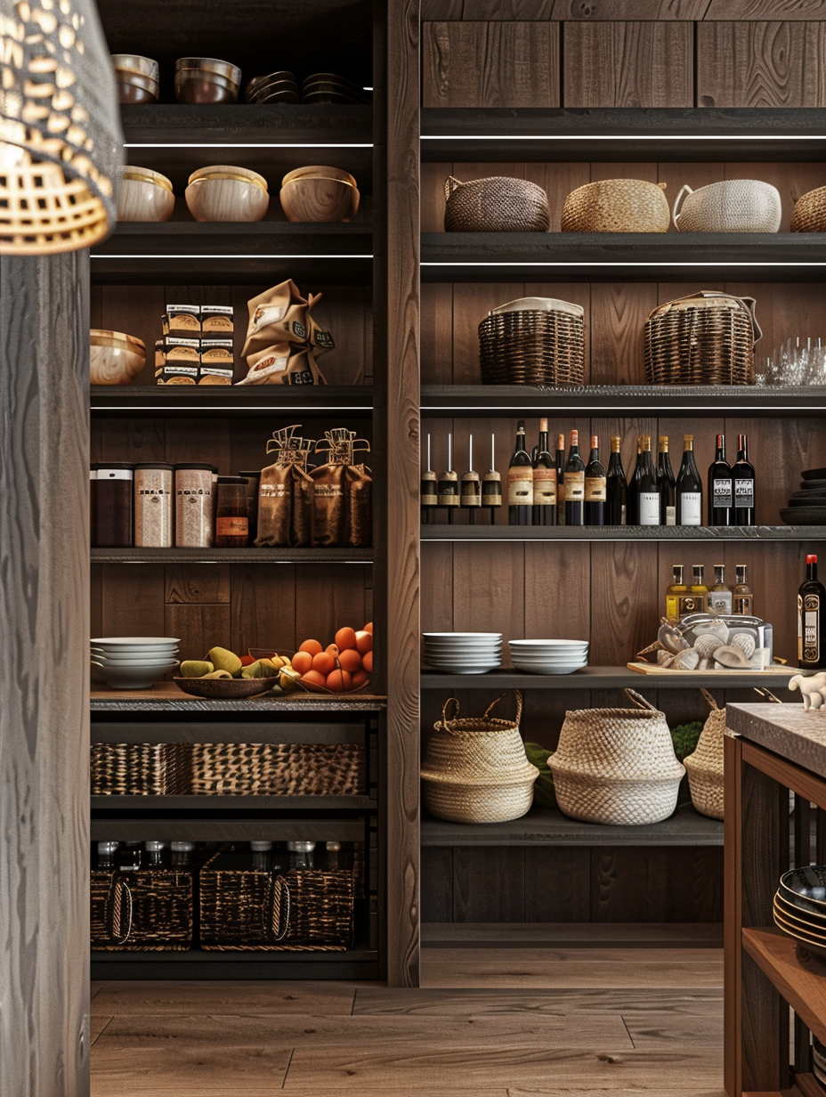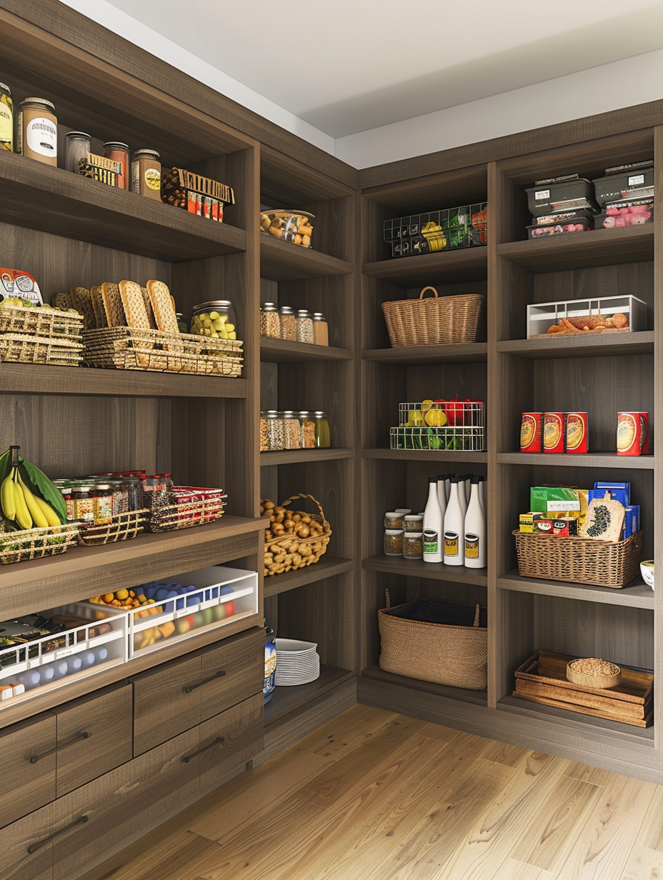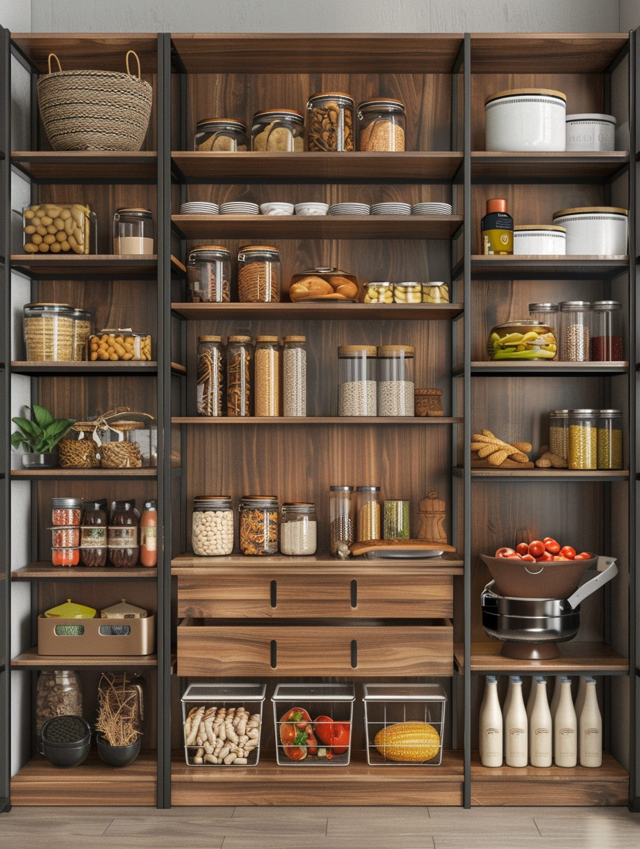 Shelving with integrated baskets, in fact, blends open shelving and the usefulness of pull-out baskets. These bins are solid for putting collectively fleeting stuffs like snacks, produce, or kitchen linens on shelves. Built-in baskets are useful in making your pantry a clean, neat place that is also easily accessed for removing frequently used items.