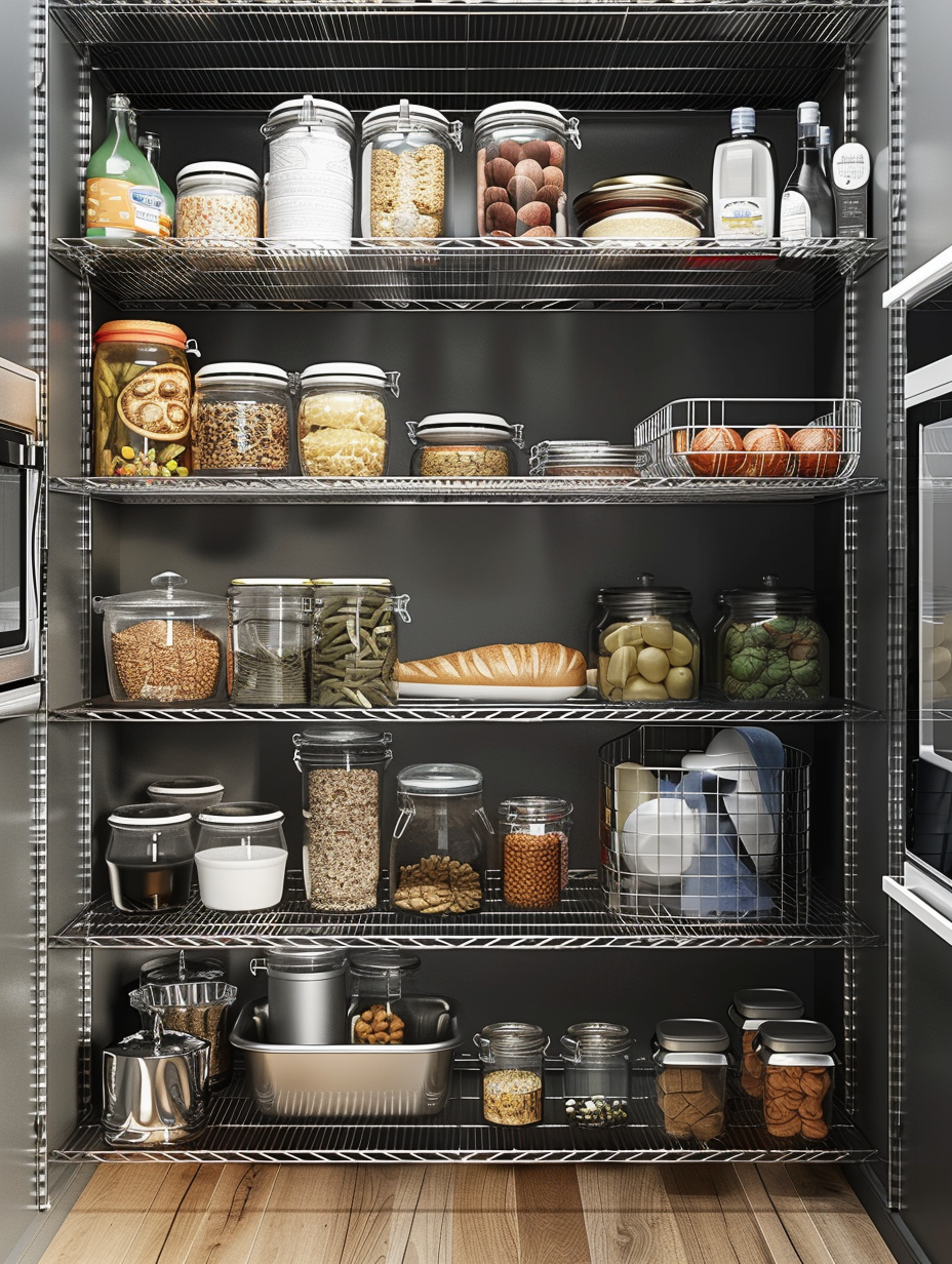 Wire shelves adjustable is the best practical and modern solution for pantry organization. These shelves can easily be adjusted to different heights, so they are a suitable place to put items of different sizes. Wire shelves are hard-wearing and are quite easy to clean, thus allowing air circulation and making and keeping your pantry fresh and accessible.
