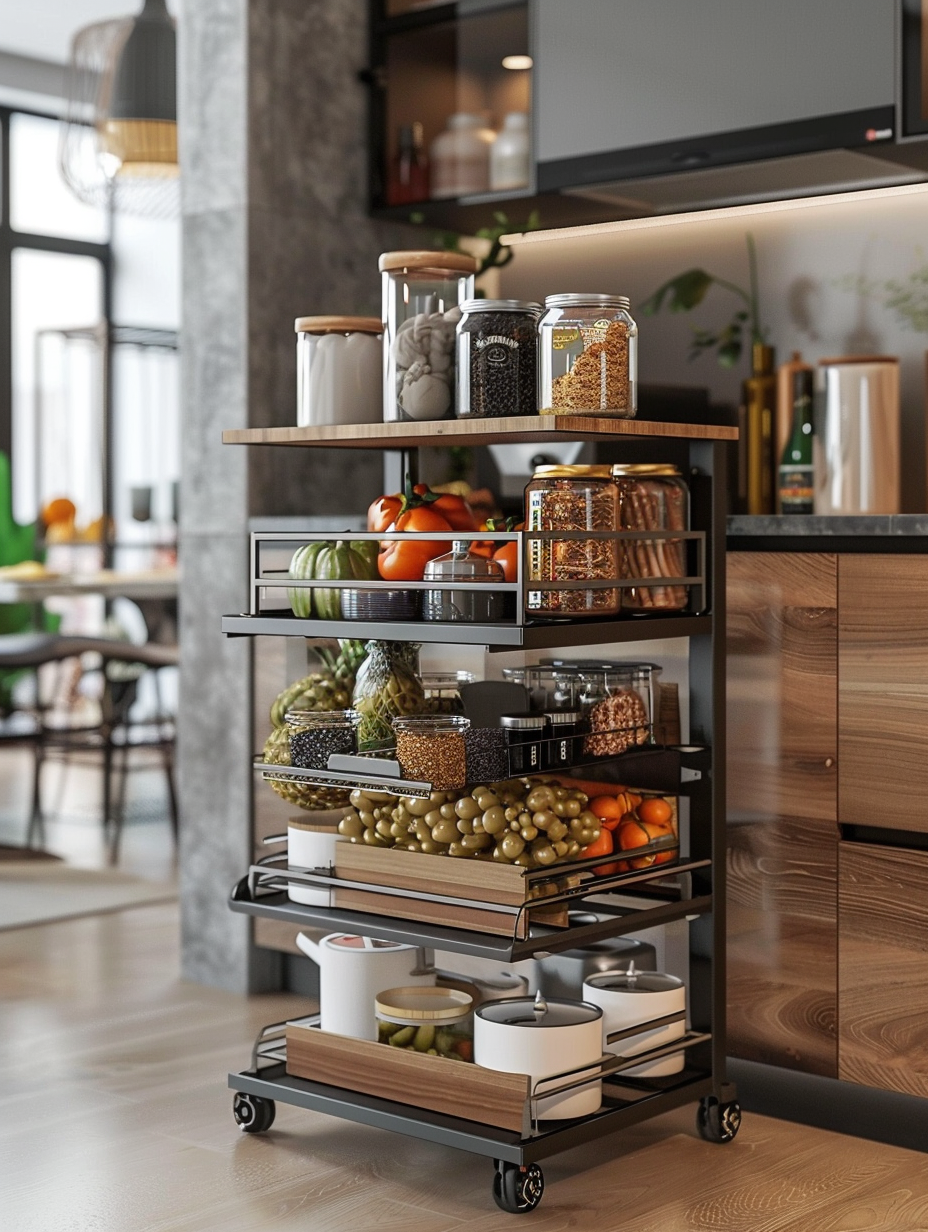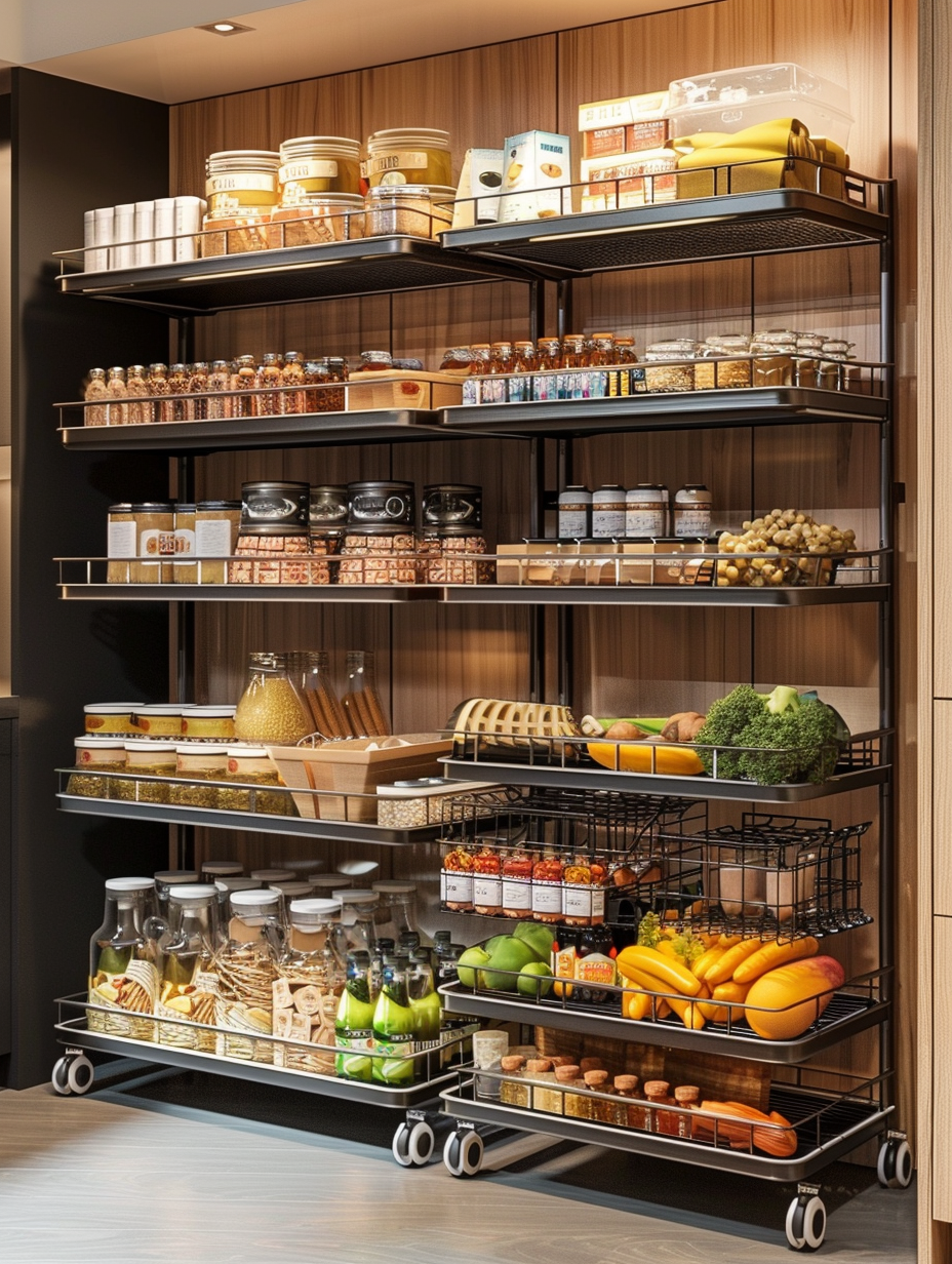 Compact rolling shelves are a good fit for small or narrow pantry spaces. These shelves can be rolled out when required and pushed out of the way when not in use. Hence, they provide versatile storage without reducing the space. Rolling shelves are a very effective storage option for keeping bulky or heavy items that are accessible and mobile.