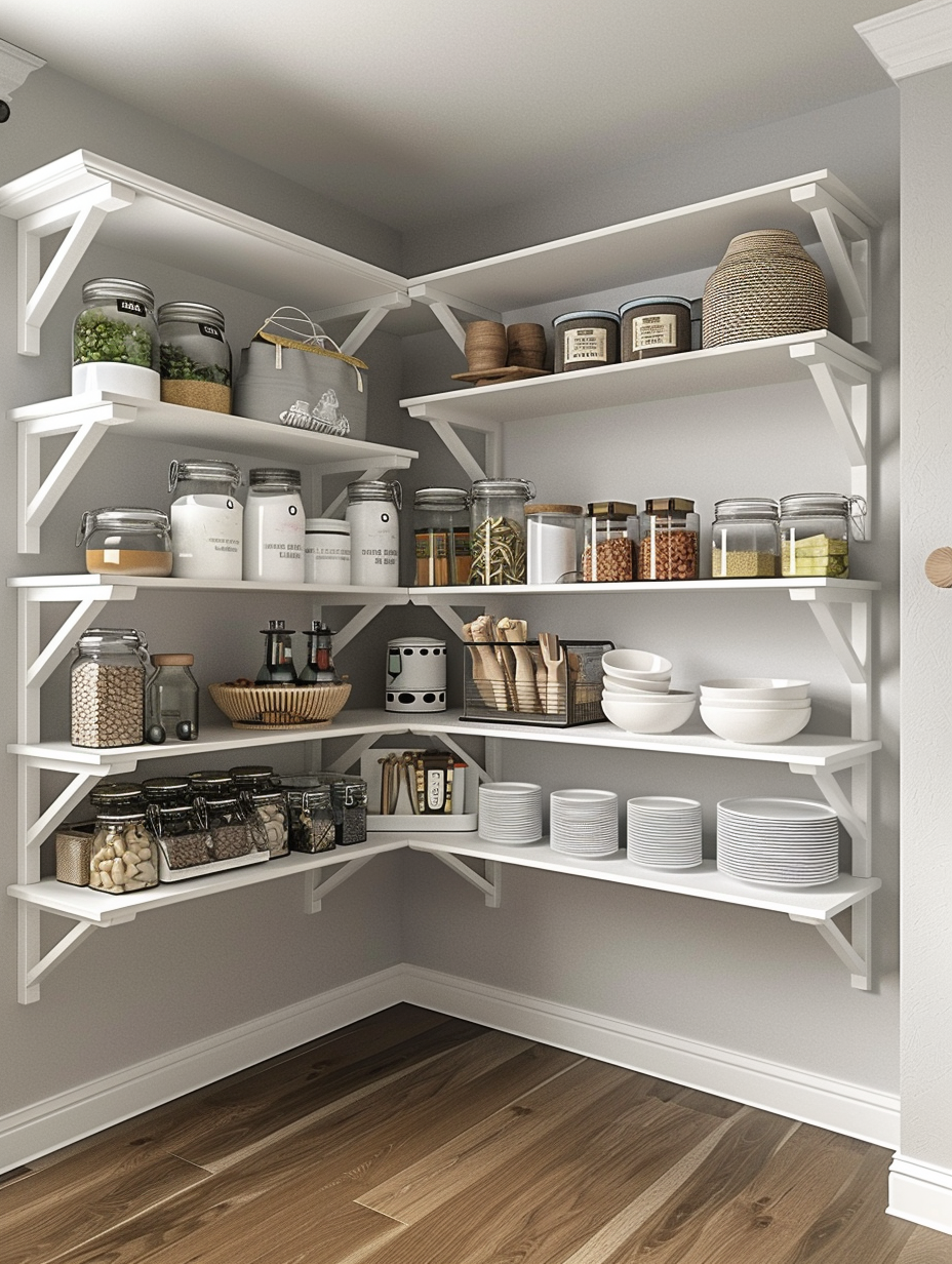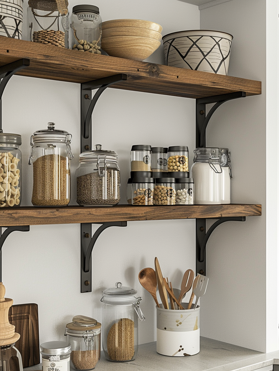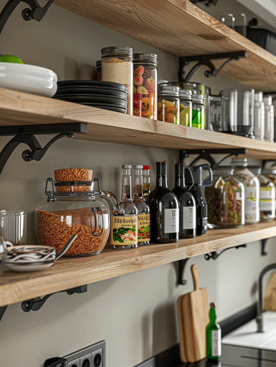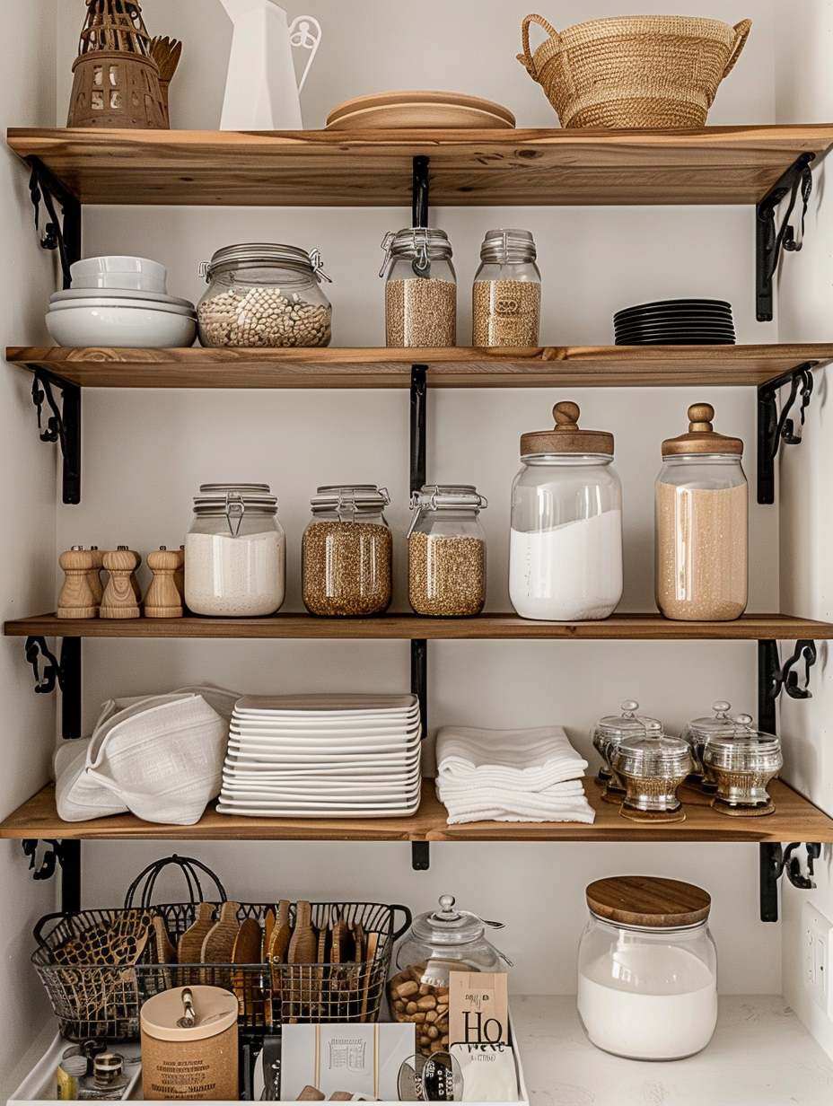 Brackets can be implemented as a way to embellish your pantry. You can select atypical brackets of various styles or finishes that will match with decor you have in your kitchen. The brackets function as shelf supports and at the same, they are ornamentation of the pantry, thus, raising the appeal of the place.