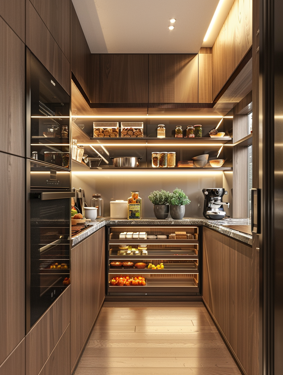 Pantries can benefit from adding shelves with light that increases both the utility and attractiveness of space. Integration of lighting makes it a not so big challenge to take and see products, especially in deeper or darker pantries. The led-strip light and the under-shelf light which are used to paint the pantry make it a bright and appealing room.