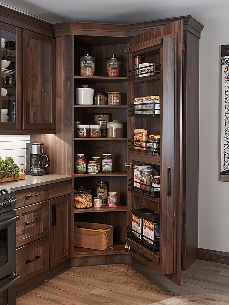 Corner units with space-saving design are the right choice for optimization of pantry corners. To maximize the space and provide additional storage, the units are designed to fit easily in the corners of the room. The corner units can be used to put small kitchen appliances and canned goods, and thus they are the best space-saving idea.