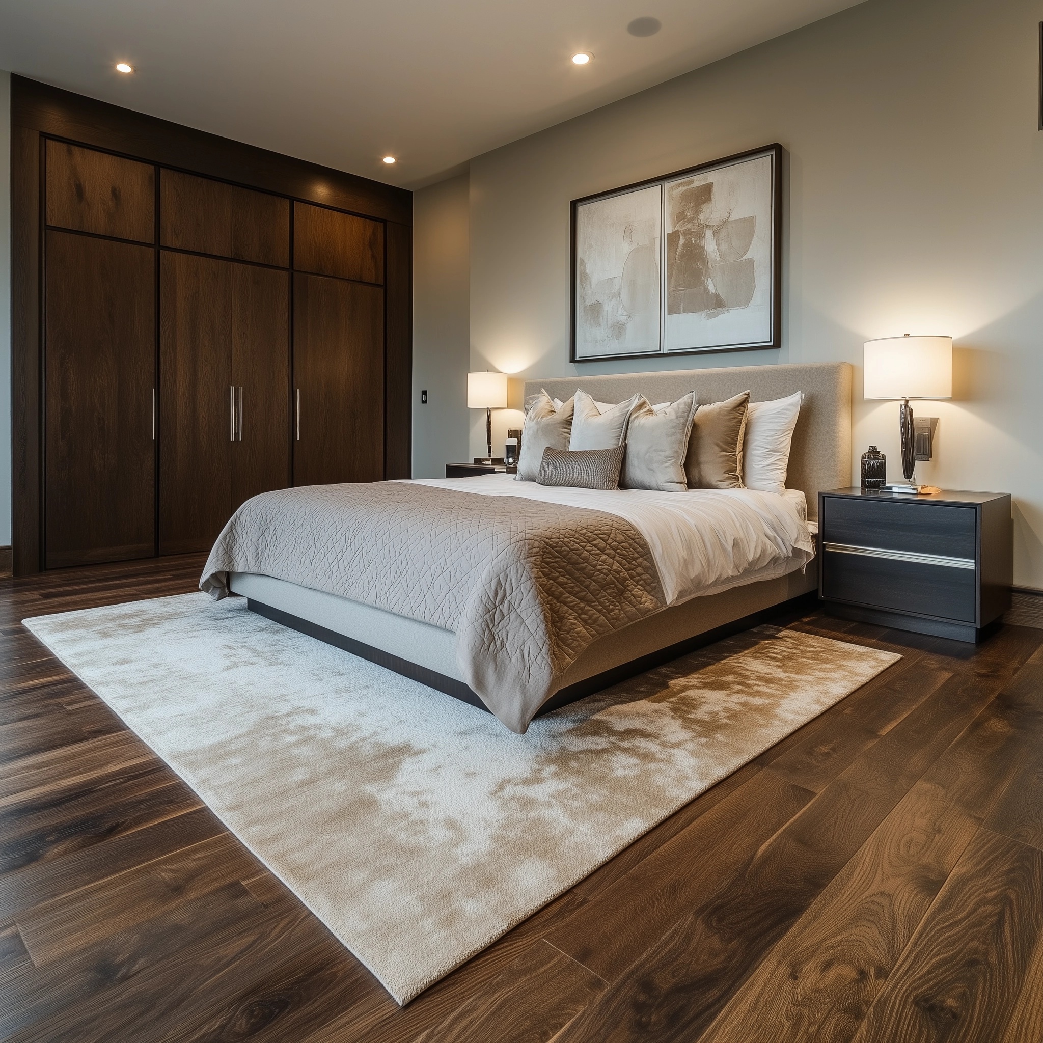 Plank flooring has the power to make a bedroom look like a whole different place. Choosing a wood tone that is in line with your furniture and one color theme with the rest of the room is the main factor needed for a peaceful restorative master bedroom. Dark-colored boards bring you a sense of intimacy and extravagance, and light ones depict a soothing and relaxing atmosphere. Softness to the rough plank floor texture be included in your areas rugs.