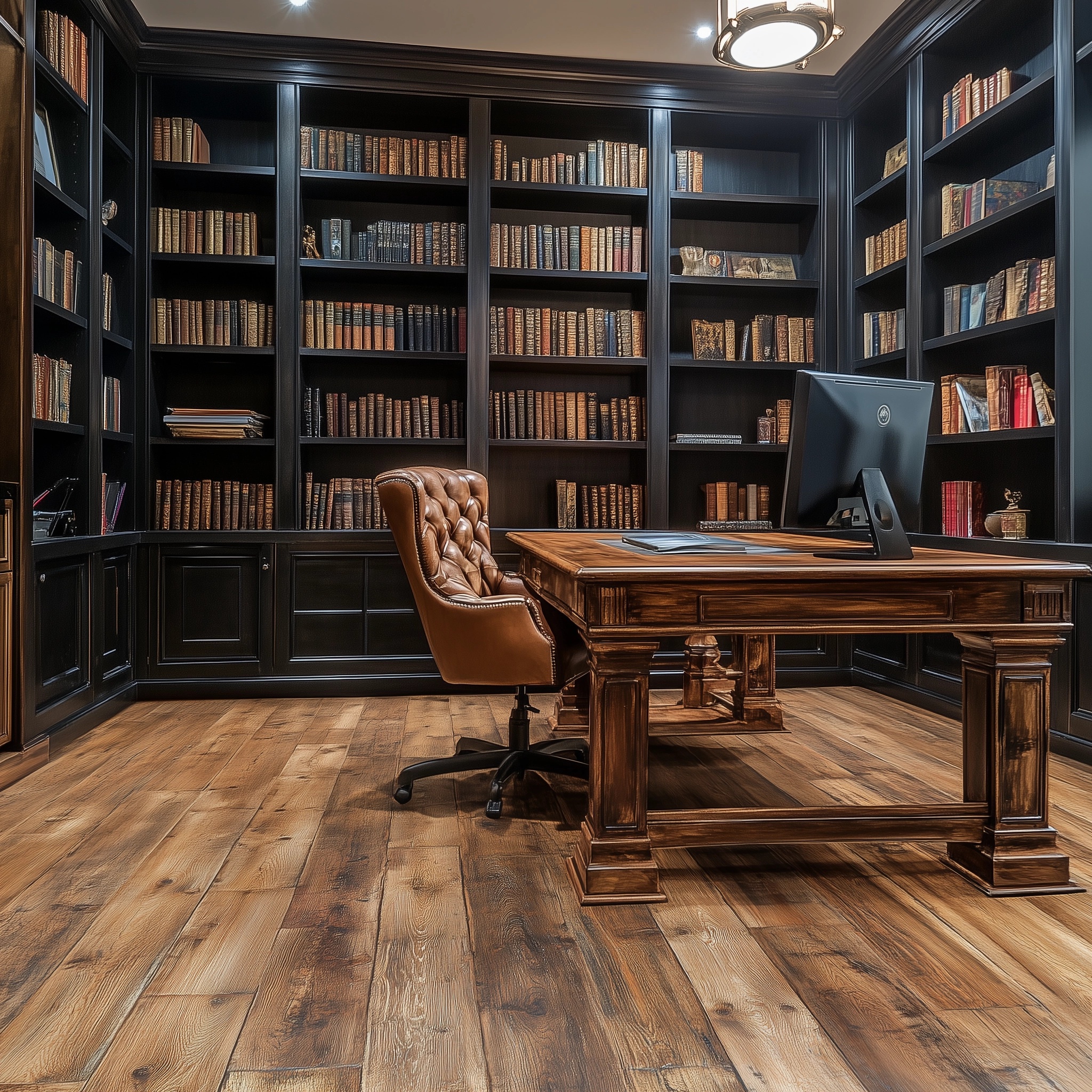 The wide plank flooring lies in luxurious and spacious areas, which take the whole system of the room to the next level and make it very impressive. Such office floorings are best suited for larger spaces, where the wide beams can be well perceived. The wood hue should be in sync with the interior decoration in general, like earthy oak giving a rustic touch or a sleeker, darker shade being the other option.