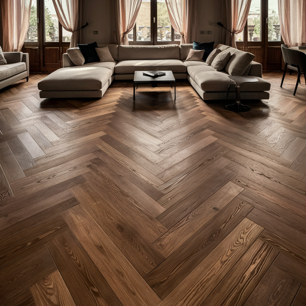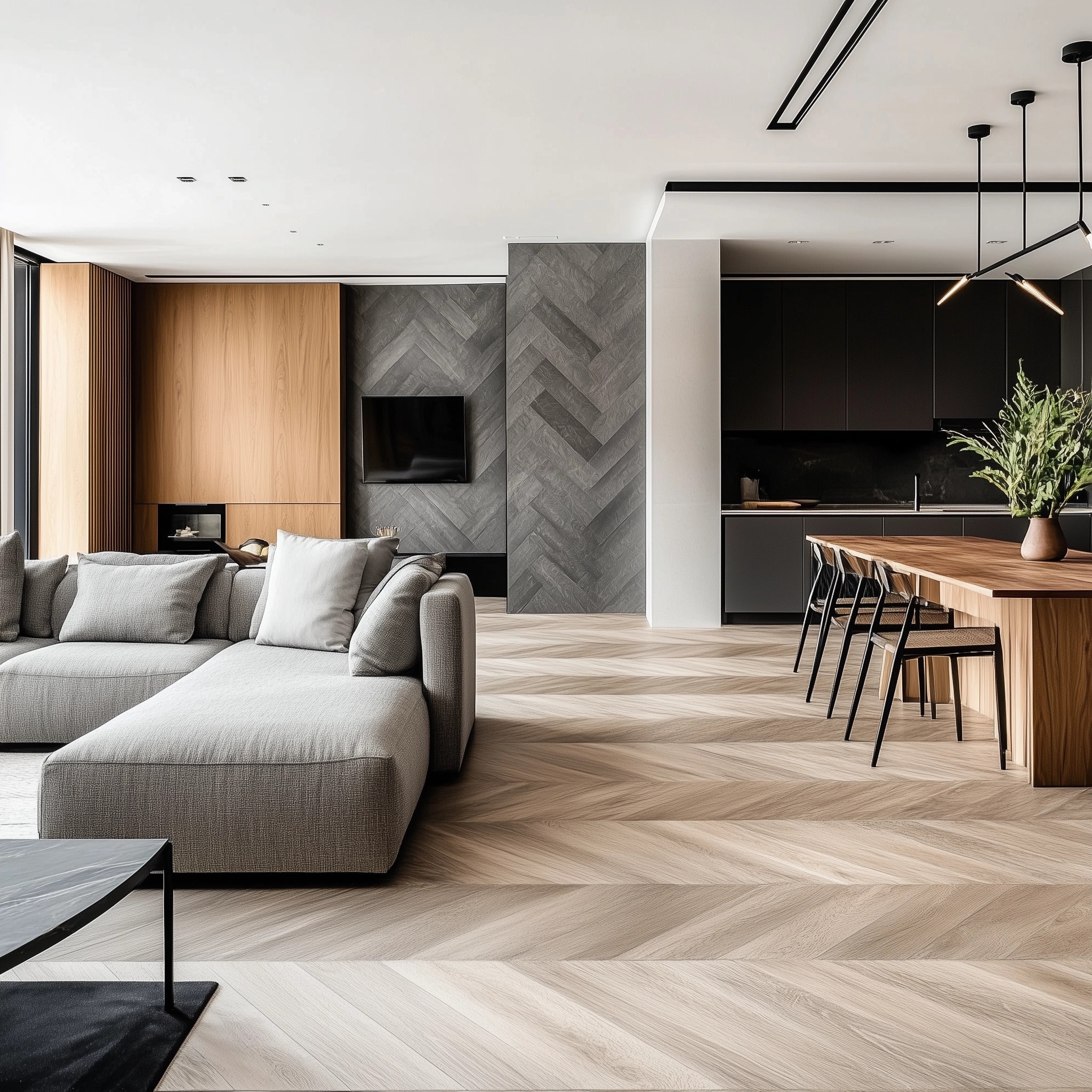 Thin plank flooring provides a sleek and modern look and is ideal for today’s interiors. The smaller beams are able to make a visually complex pattern by virtue of being the thinner of the two. This approach is also suitable for what are known as cozy spaces, where the thin planks can visually expand the room. Using straightforward furniture and accessories will create a clean, modern look.