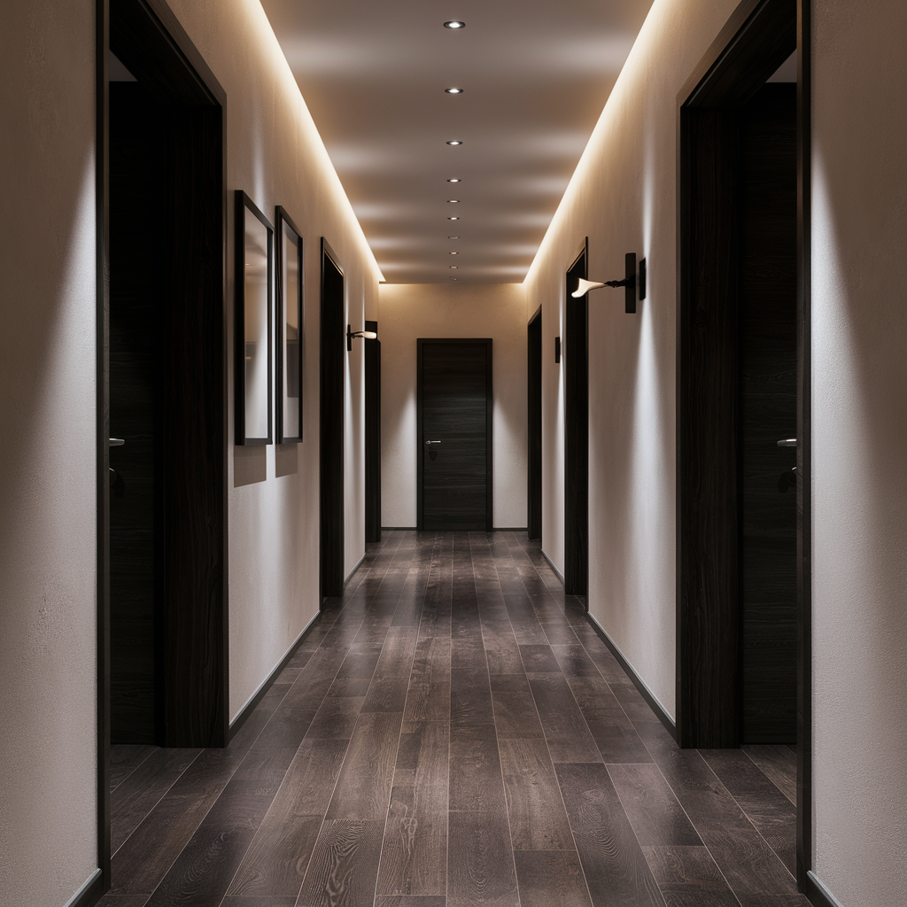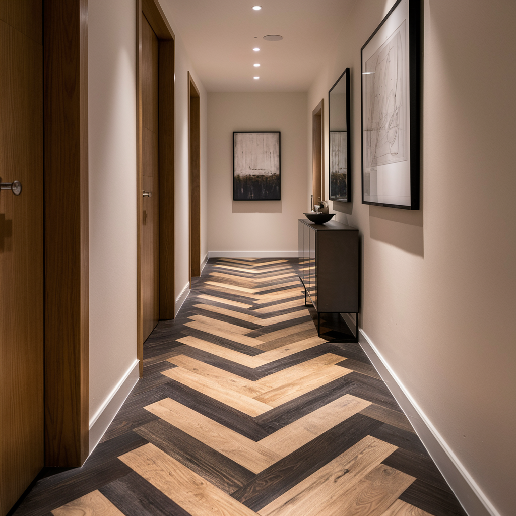 Hallways are notoriously heavy-traffic areas that require floor solutions that are durable as well as stylish. Vinyl is a flexible material to use for flooring, expressing not only the functionality but also the appeal. Thicker wear layers are recommended if you want to make it resistant to the wear of foot traffic, and a darker wood tone may be the most appropriate choice as it tends to hide dirt and scuffs.