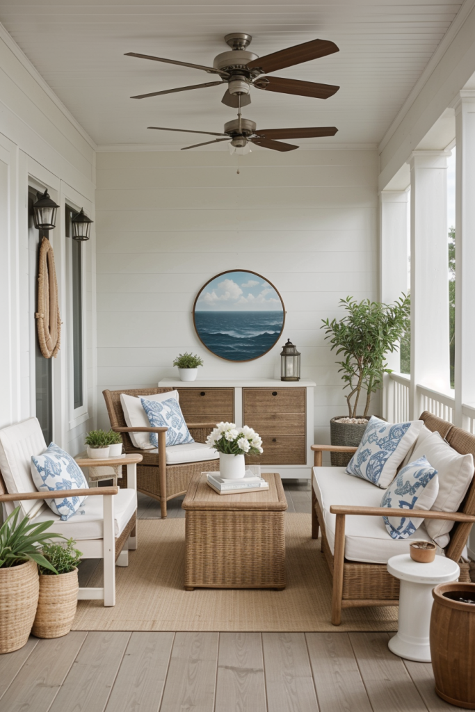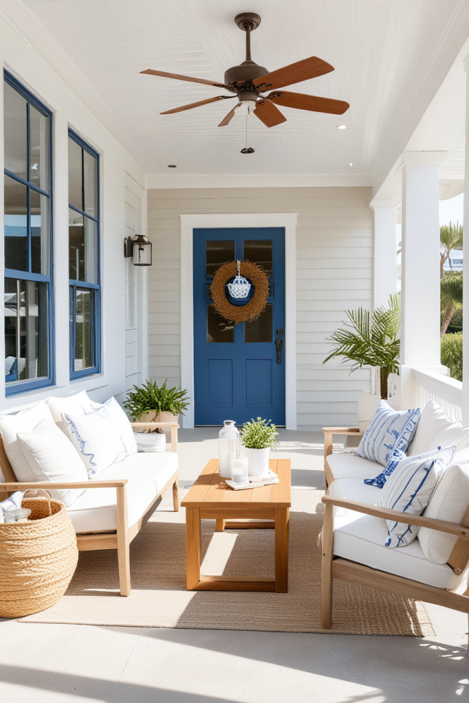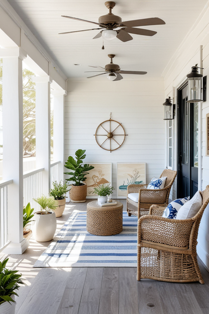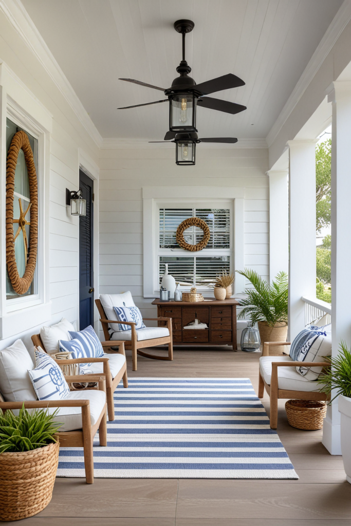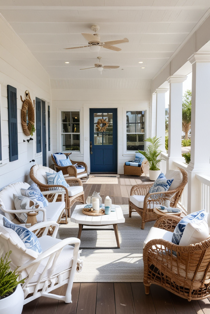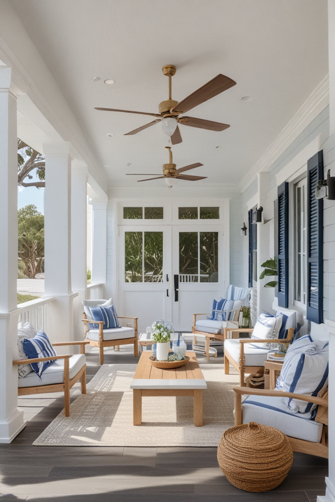 The initial step to achieving the ideal coastal porch is to use a modern color scheme with calming blue tones, sandy neutral shades, and crisp white accents. One can adopt this strategy for nautical decor and apply it to accent walls, statement pieces and furniture so everything exudes a coastal yet designer vibe.