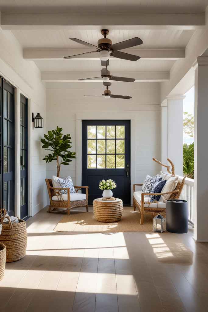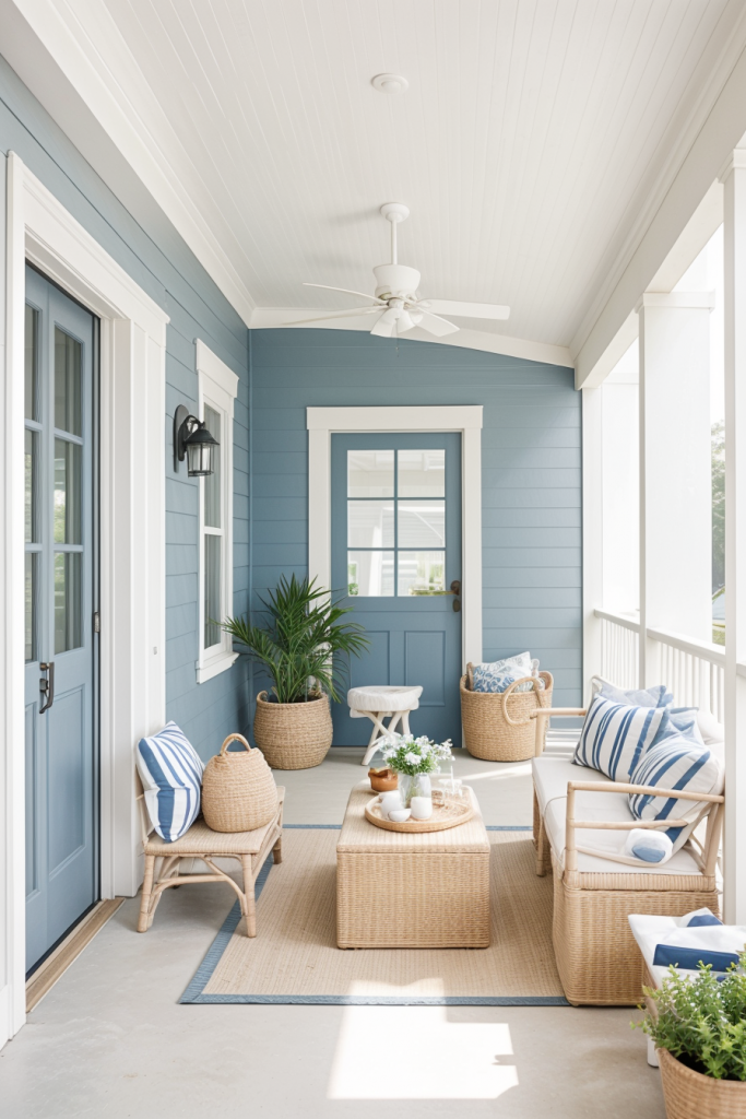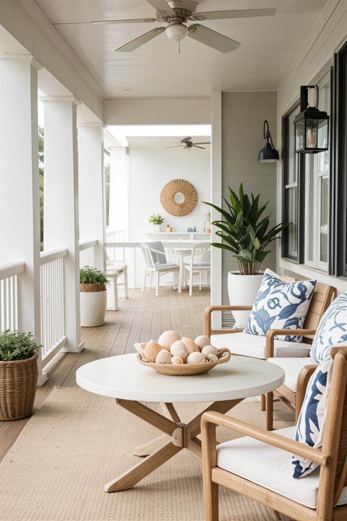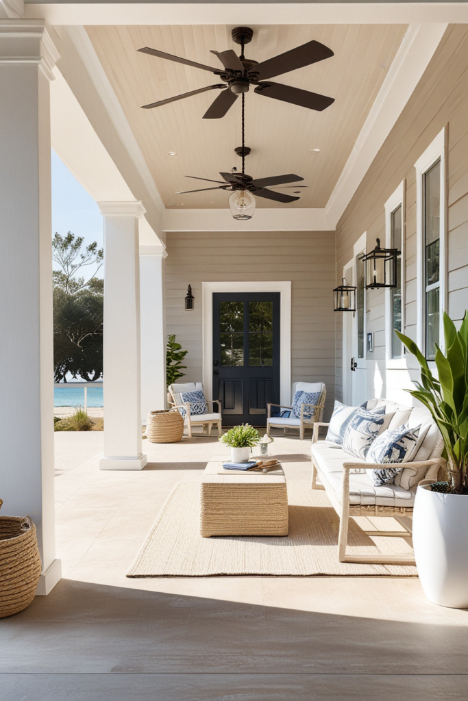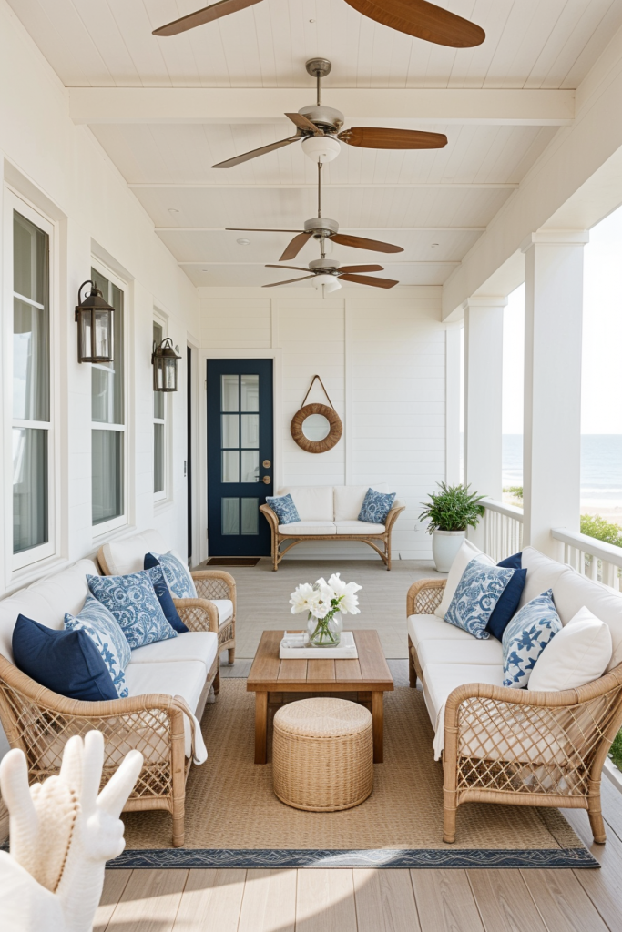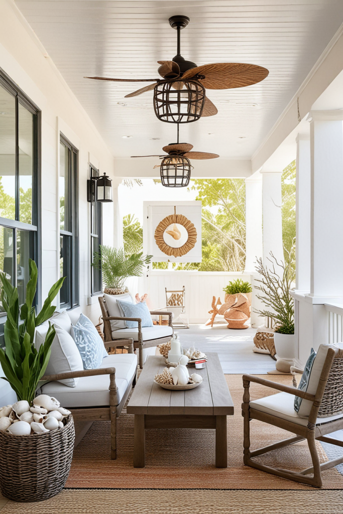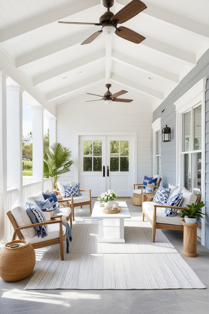 The initial step to achieving the ideal coastal porch is to use a modern color scheme with calming blue tones, sandy neutral shades, and crisp white accents. One can adopt this strategy for nautical decor and apply it to accent walls, statement pieces and furniture so everything exudes a coastal yet designer vibe.