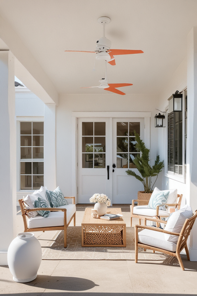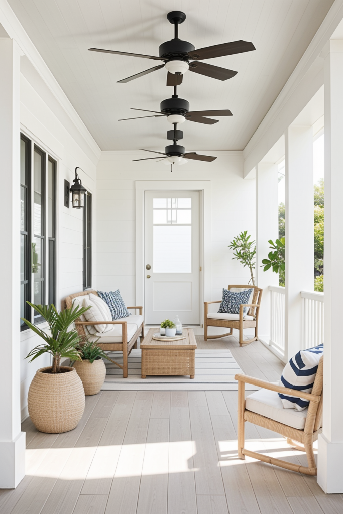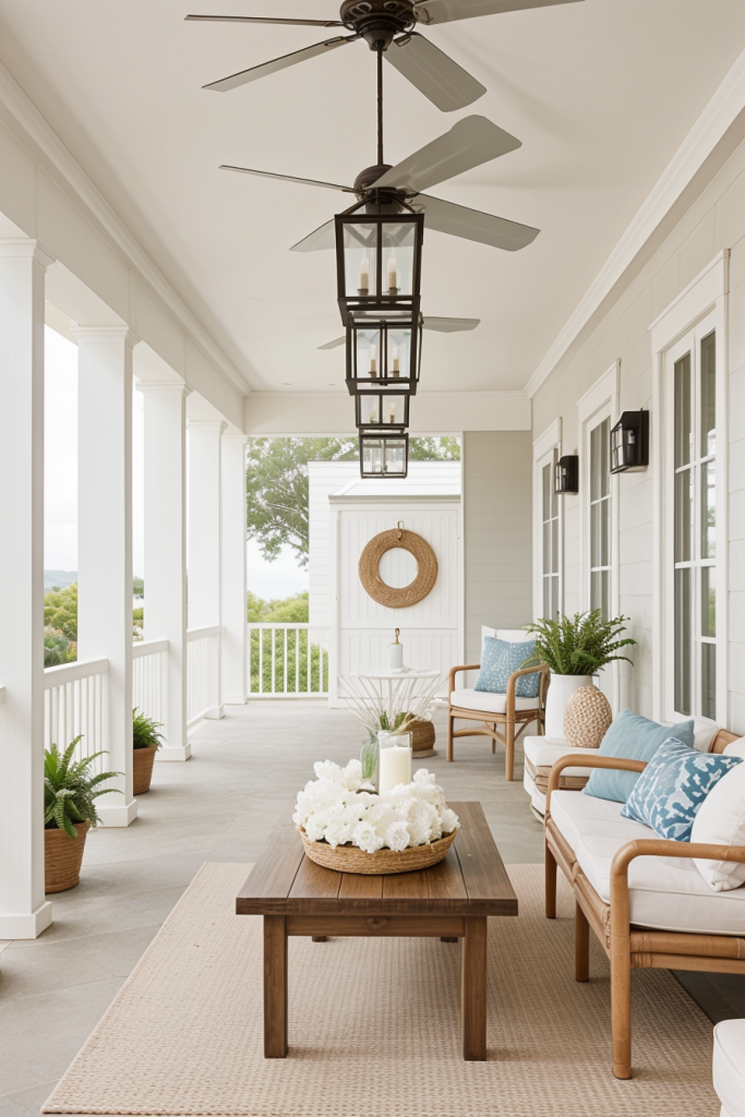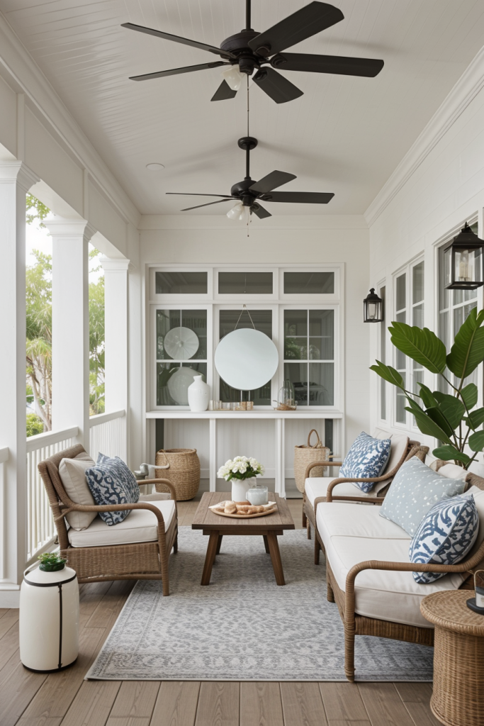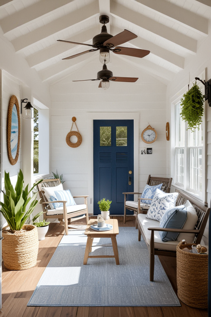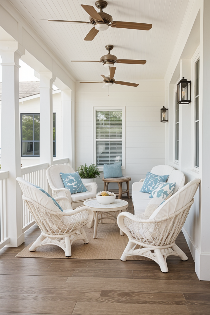 The initial step to achieving the ideal coastal porch is to use a modern color scheme with calming blue tones, sandy neutral shades, and crisp white accents. One can adopt this strategy for nautical decor and apply it to accent walls, statement pieces and furniture so everything exudes a coastal yet designer vibe.