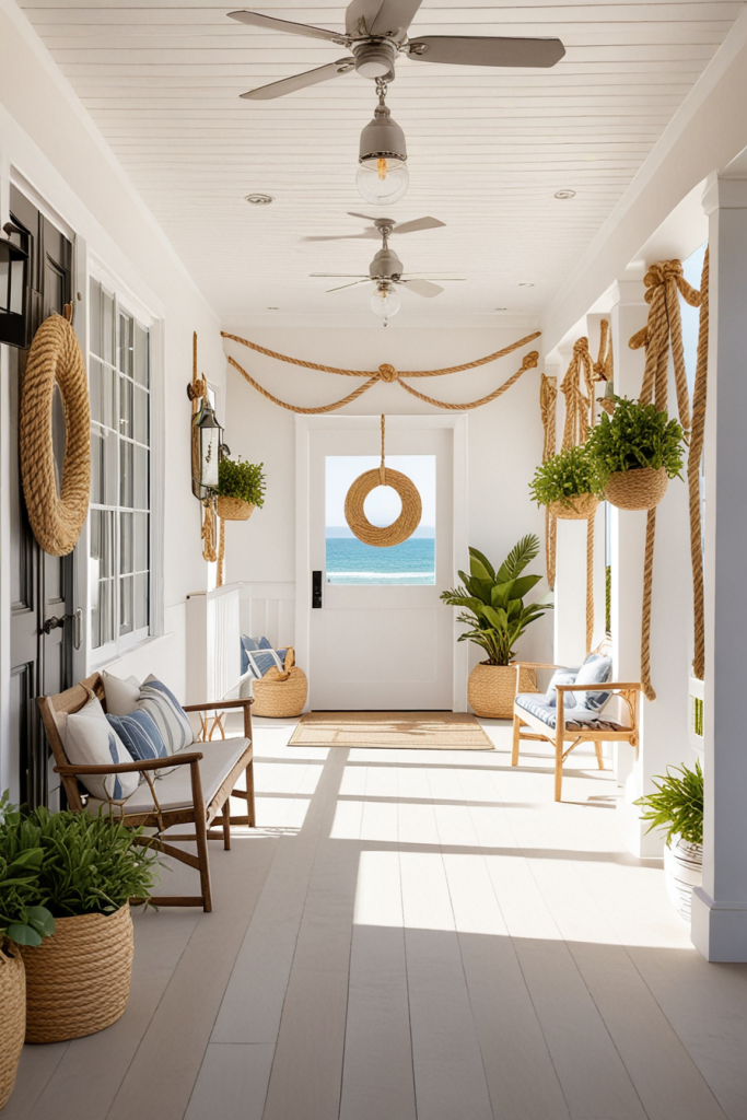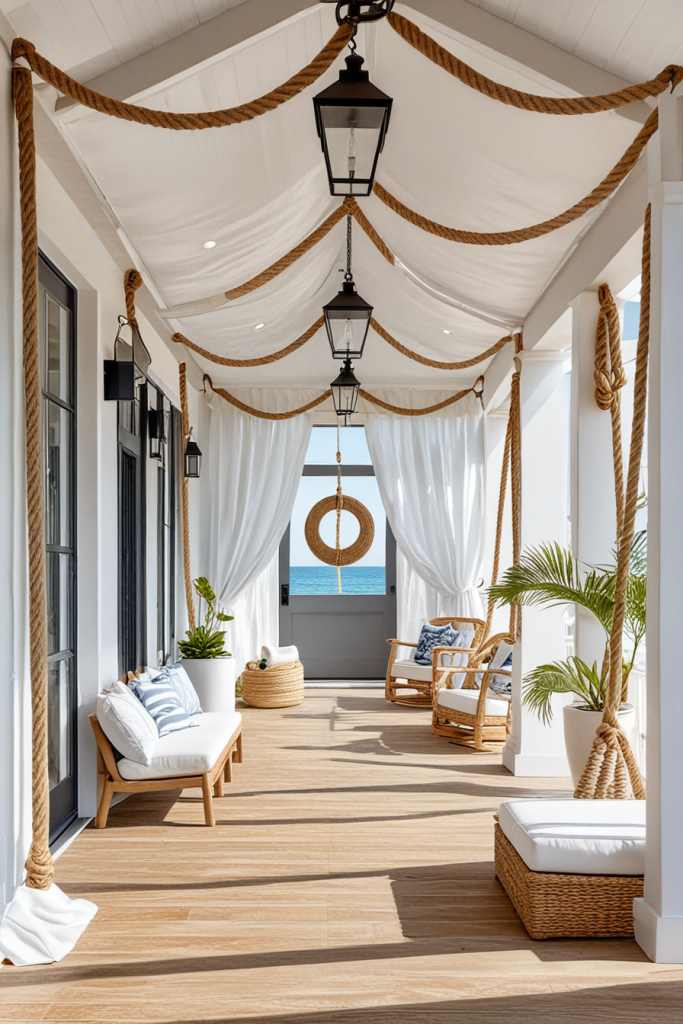 Ropes are woven into subtle patterns which add a tactile sense to coastal porches while not overpowering the modern style. Ropes bring a certain finesse to the decor and serve to increase the overall designer charm of the area. The rope styling pays homage to maritime culture while simultaneously featuring a modern look, whether used as trim or furniture styling.
