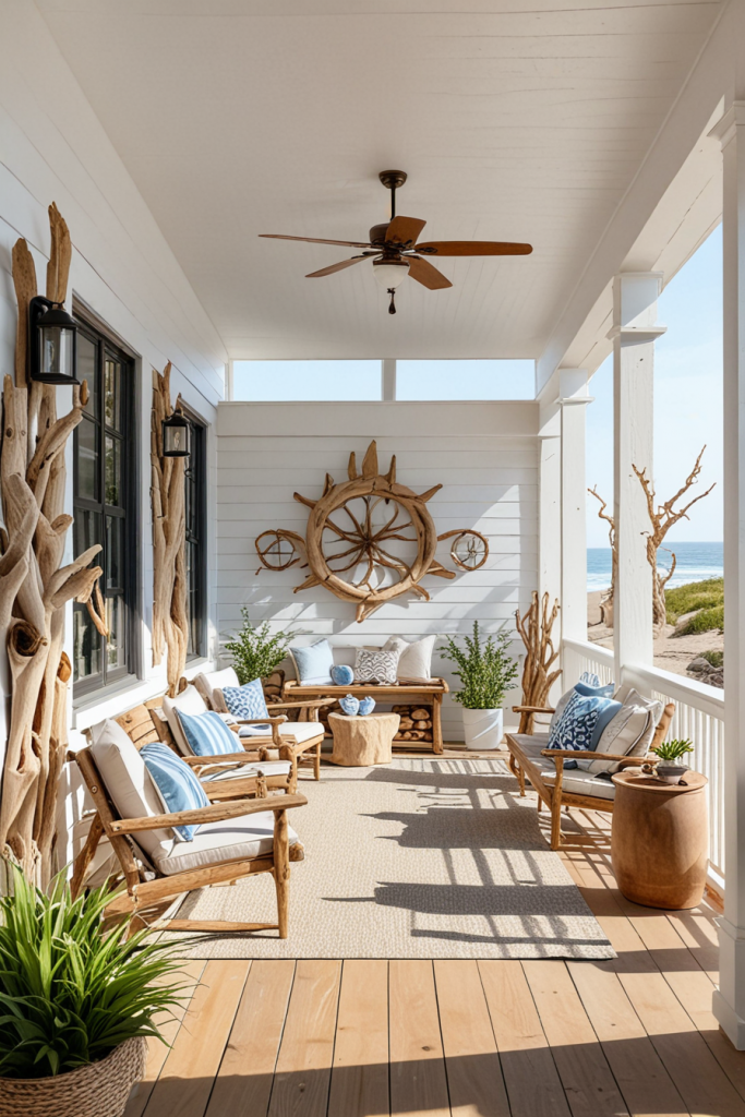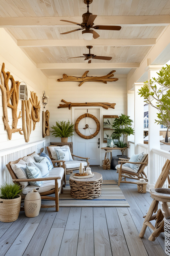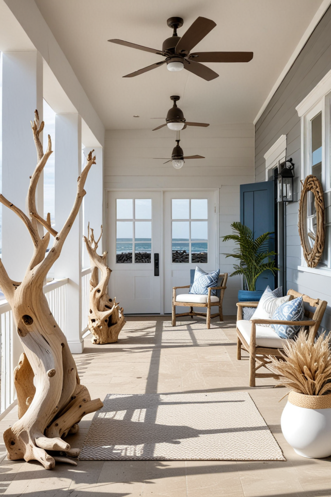 Captivating driftwood art installations bespoke of nature’s untamed splendor integrate art at the level of modern design storytelling. These sculptural forms effortlessly combine with engineered decor details in a coastal porch and becomes the centerpiece and conversation starter, possessing exquisite organic shapes and nature’s furrowed textures evoking artistryemerging from nautical themes.