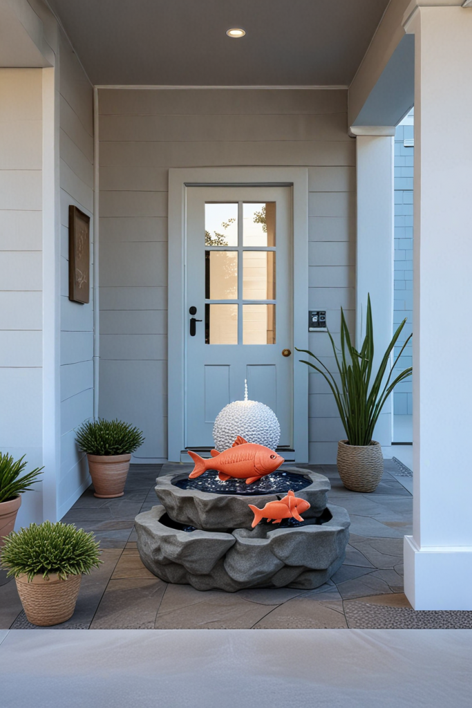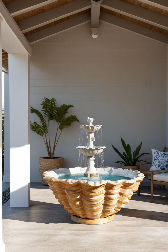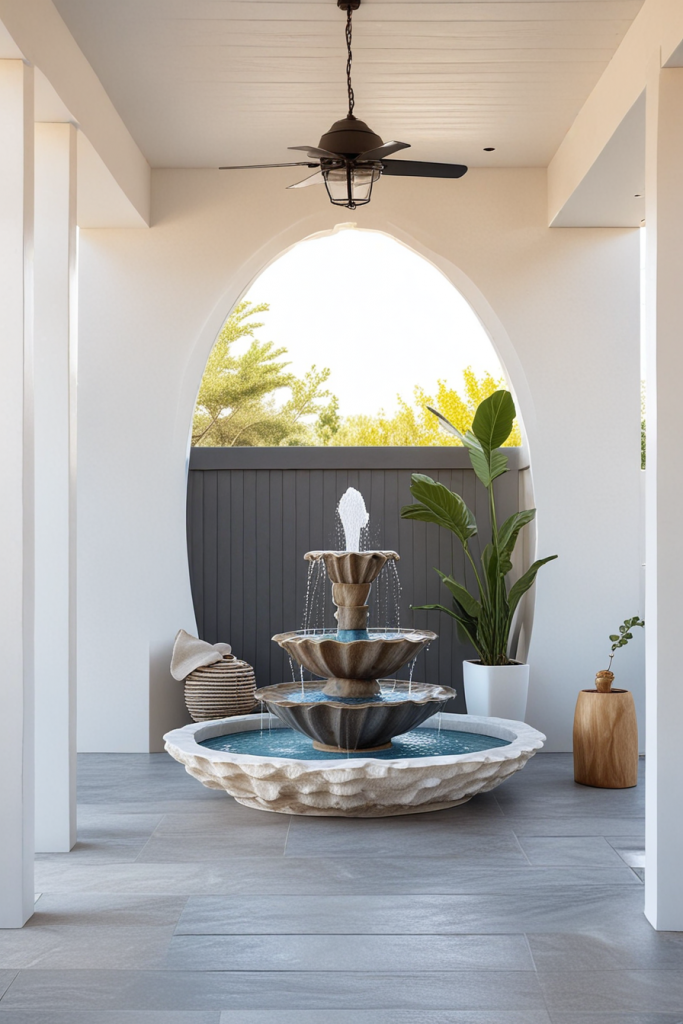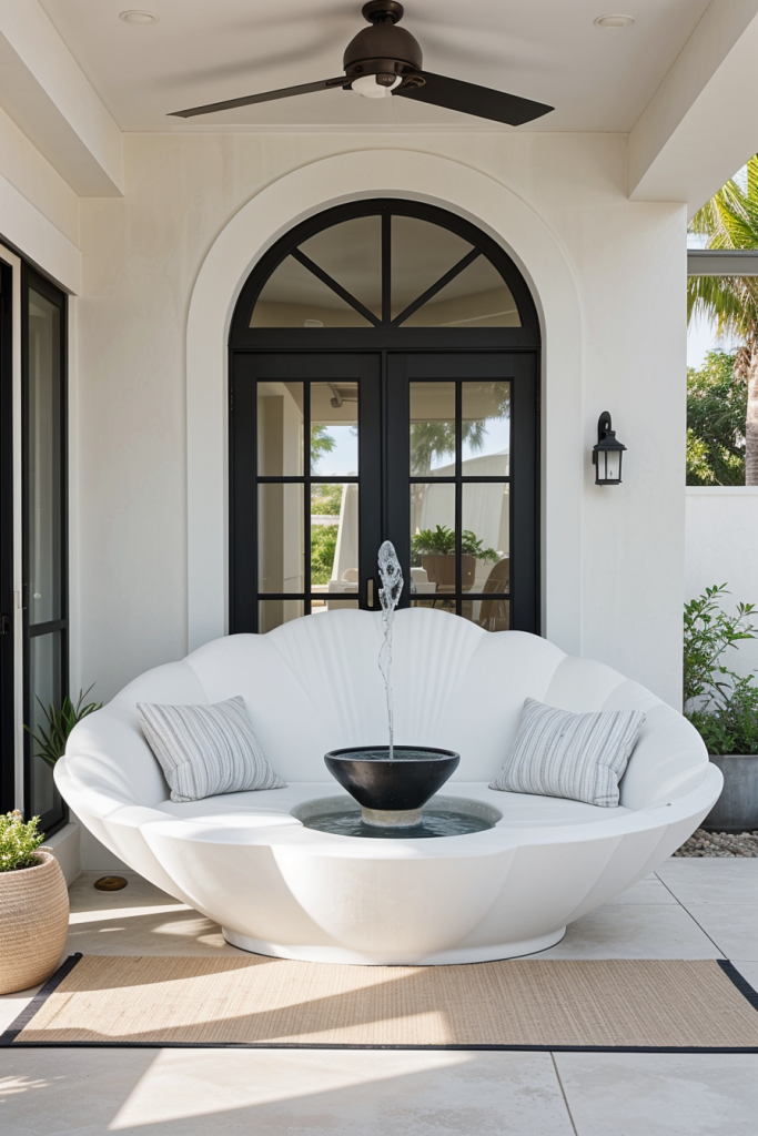 These nautical-themed fountain installations have a sleek, minimalist style, perfectly capturing the soothing seaside charm, complemented by the modern, timeless design. While functioning as stunning decorations that blend seamlessly with the nautical design, such fountains create the soothing illusions of ocean sounds. Their placement further enhances the serenity of the space, complemented by the designer details that integrate water features into the outdoor living area.