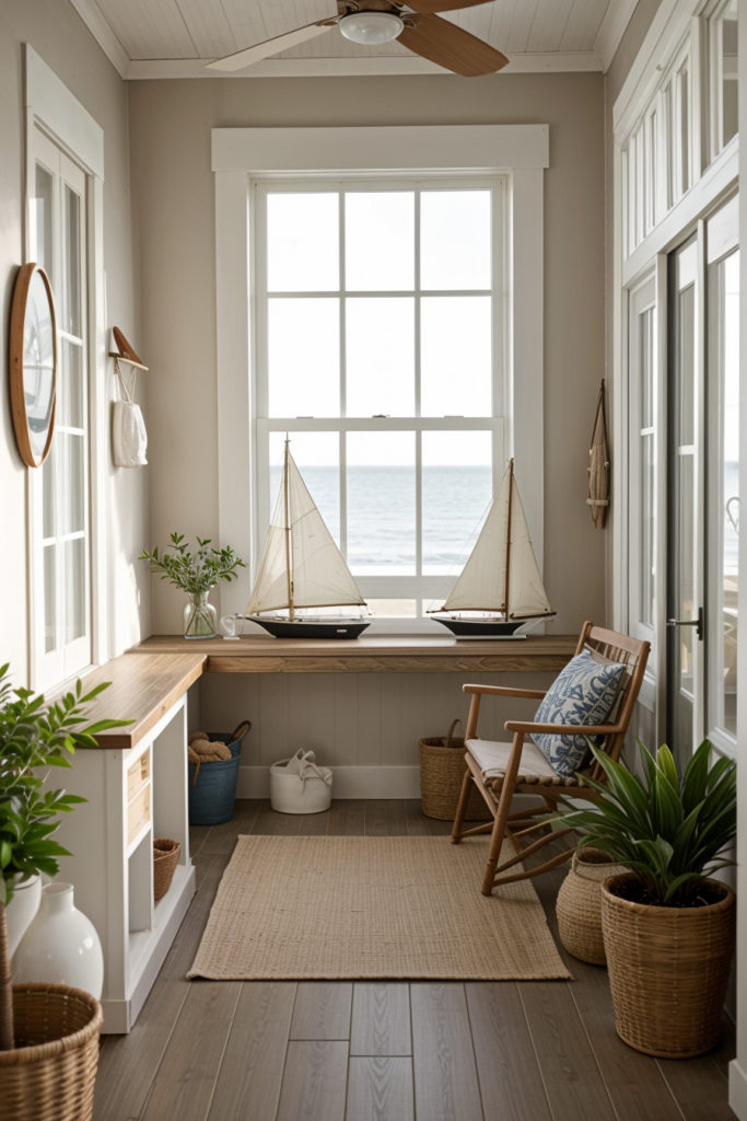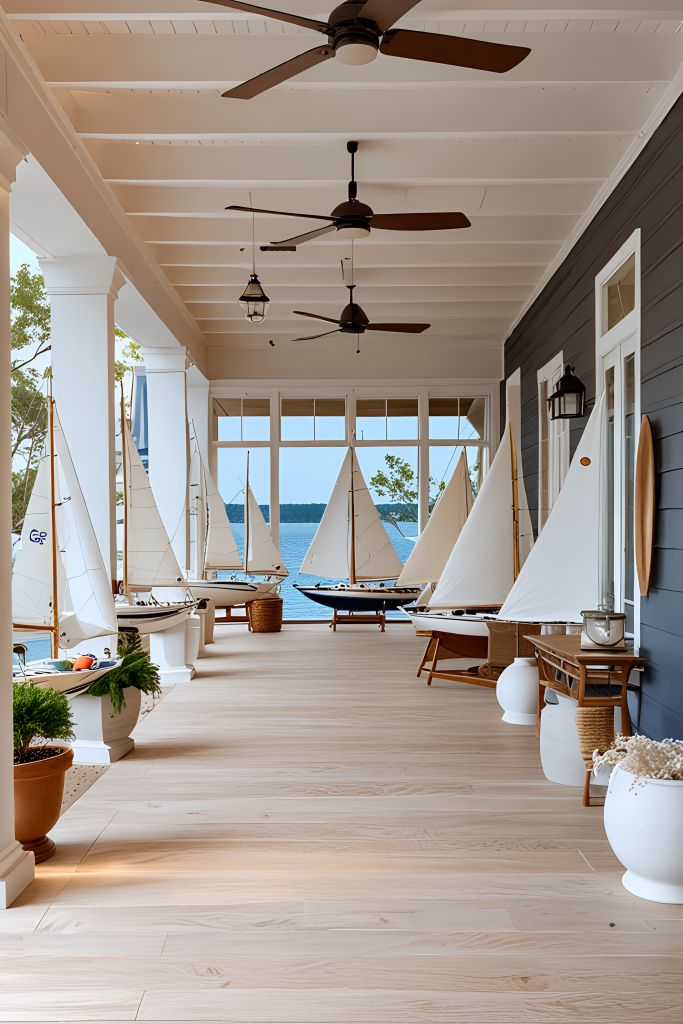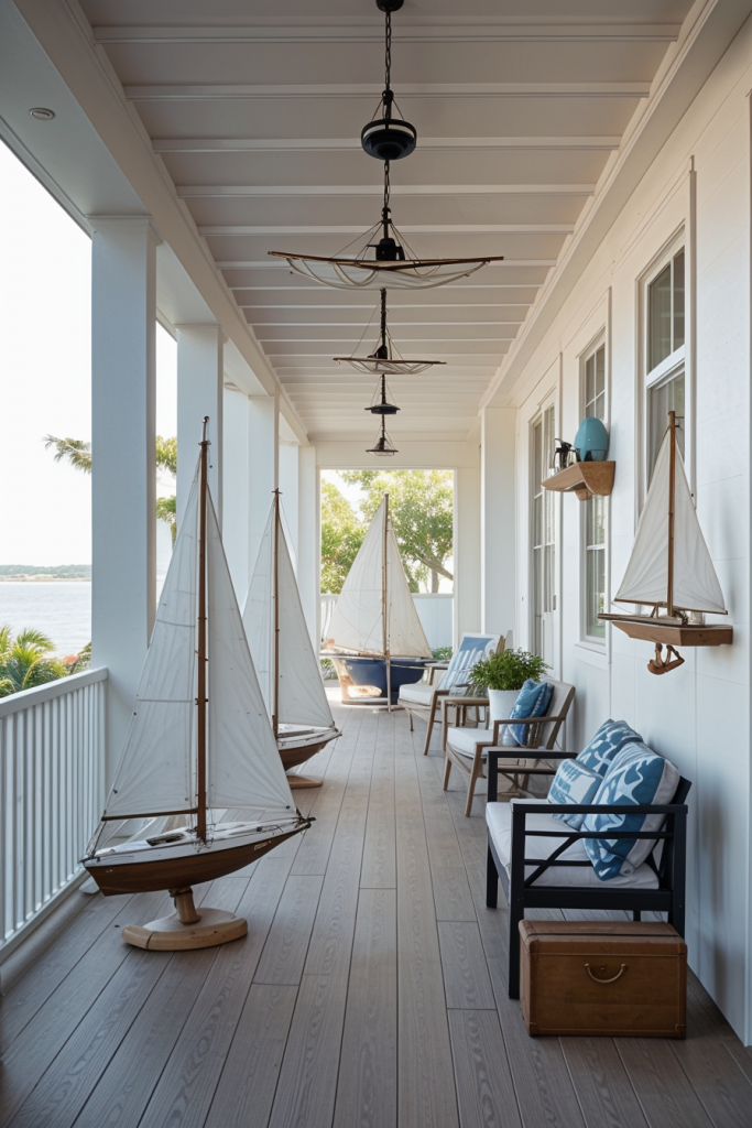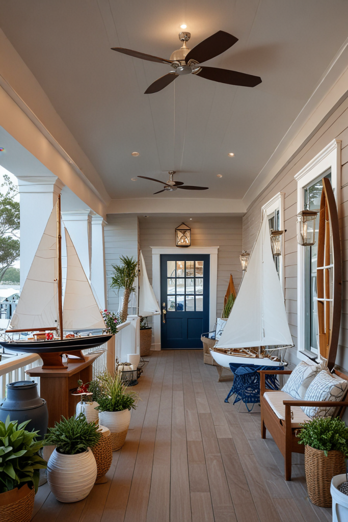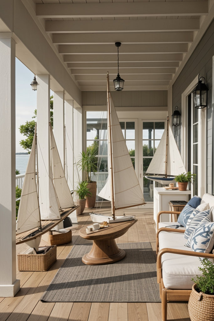The tiny sailboat models that capture the spirit of the sea occupy pride of place on the coastal porch hearth. These contemporary exhibits are adorned with intricate details, transforming them into icons of meticulous artistry that serve as both a conversation starter and a design element. Their arrangement on the porch tells a breathtaking story of craftsmanship combined with the best features of nautical adventure, which is further stoked by the creativity of a designer.