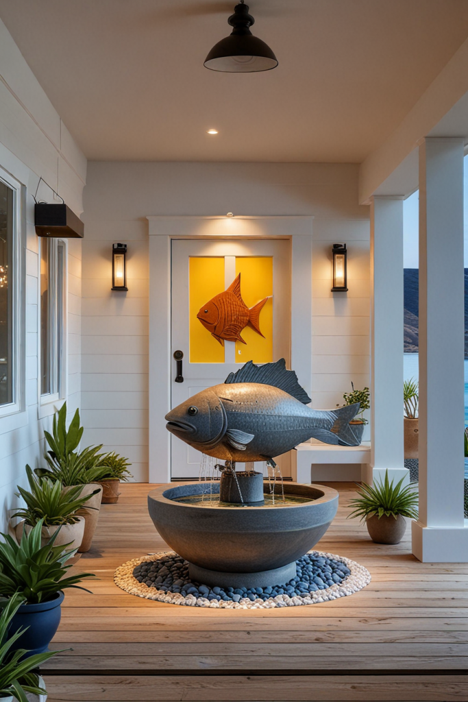 Fitted with a sleek form of integrated nautical décor, the fountain on a coastal porch evokes the sounds of gentle waves making it’s the perfect centerpiece. The distinctive modern design superbly integrates nautical décor offering a blend of beauty and restfulness. Resting on the fountain, the gentle water flow creates a serene dynamism in the area.