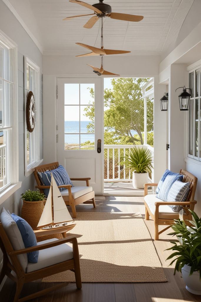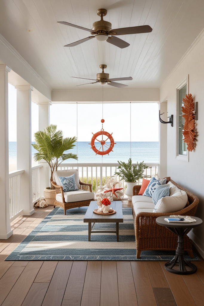 The coastal porch’s space demarcation is transformed with the integration of advanced modern nautical furniture which features flexible seating, floating furnishings, and advanced decor. Contemporary modern furniture and nautical motifs are sophisticatedly arranged to serve a purpose without compromising style, while every inch of the space is afforded maximum comfort and visual appeal by the designer structured layouts.