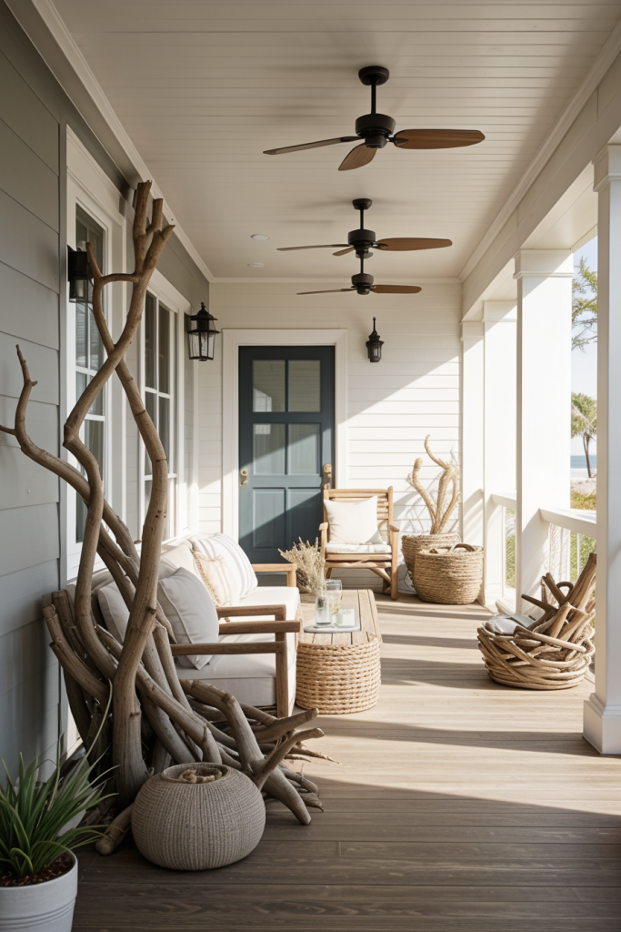 Using contemporary driftwood accents brings added textural features of nature, which contradicts the sleek aesthetic of a coastal porch. With their distinctive outlines and natural surfaces, these items add a designer touch appreciated in modern nature urbanism that visually integrates beautifully with the city. They embody effortless ingenuity, balancing rustic charm and elegance at the same time.