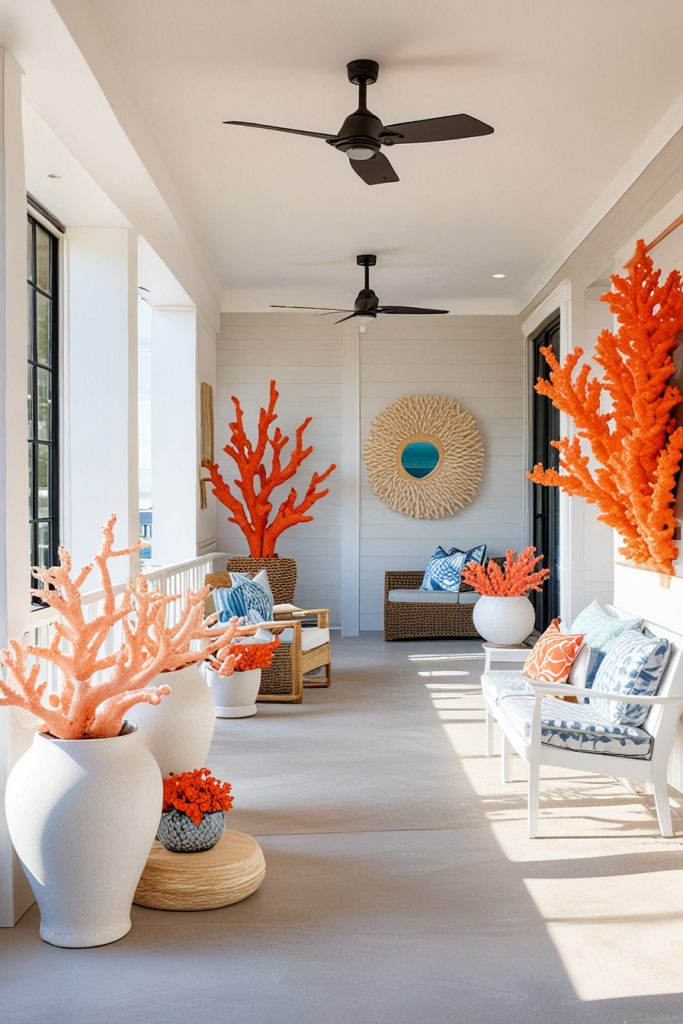 Including sea coral accents will add a quiet vibrance that matches the ocean’s beauty. Sea coral pieces serve to evoke conversation and are a perfect balance between modern minimalism, nautical decor, and designer elegance. Whether set as centerpieces or as decorative pieces of art, sea corals breathe life and texture into the porch setting.