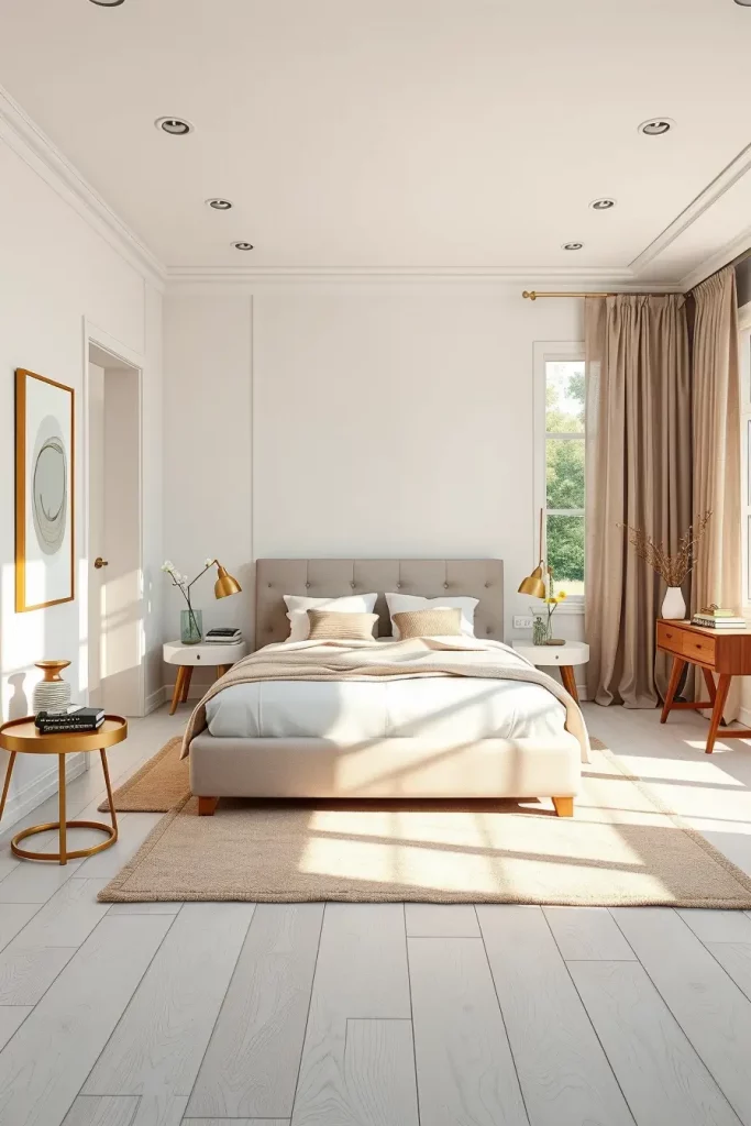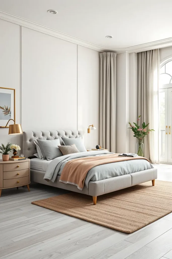 Pieces within this palette should consist of an upholstered bed that is either ivory or greige, an area rug that is sand-colored, and wood tans that are muted with a finish, such as white oak or the bleached walnut. I would not use any shiny metal in this case but would go toward more brushed or matte. Throw pillows, bedding, and curtains all should harmonize in a combination of cottons, linens or cashmere, each adding to the all over impression of comfort without the luxury.