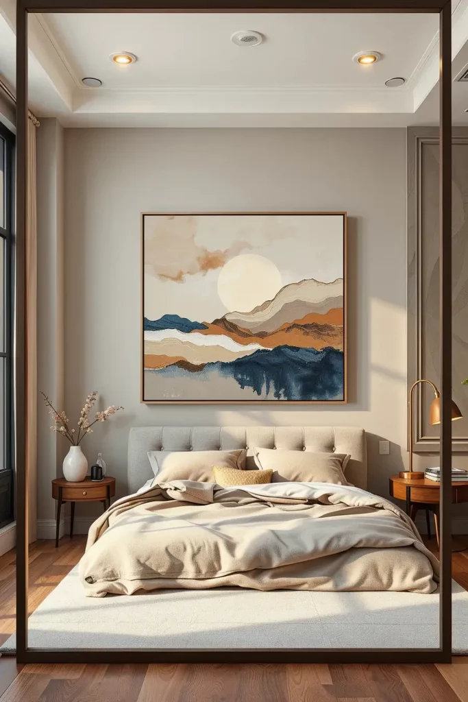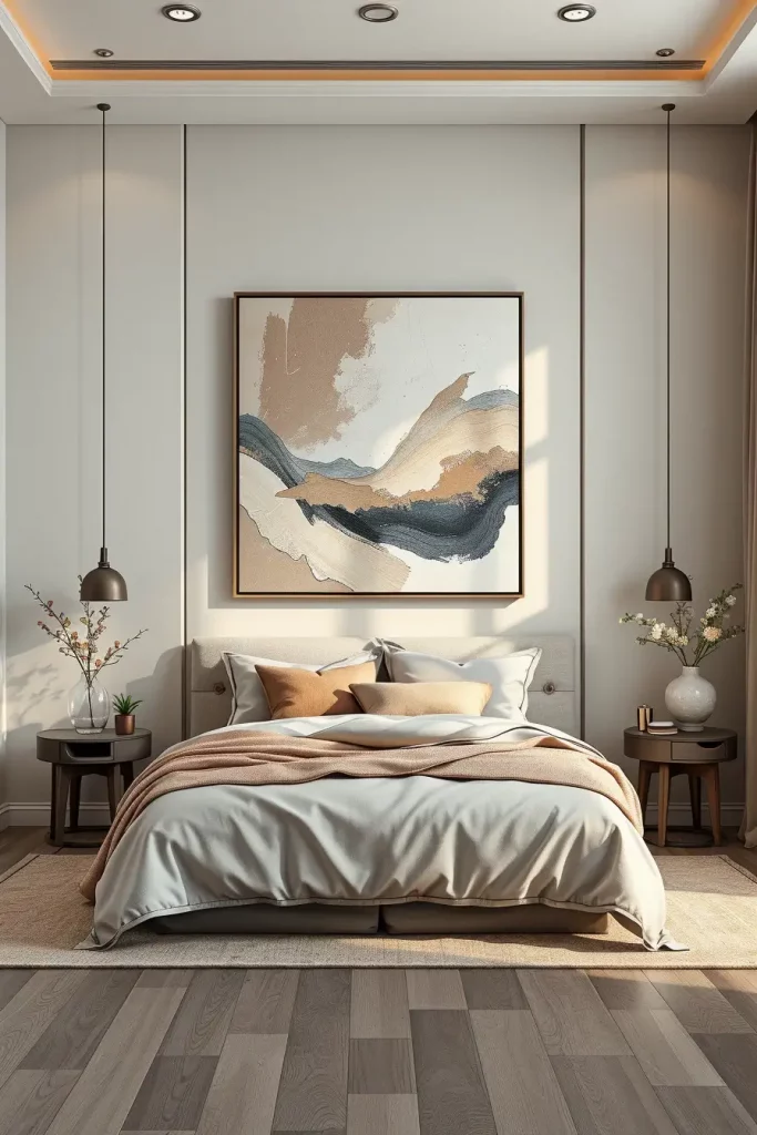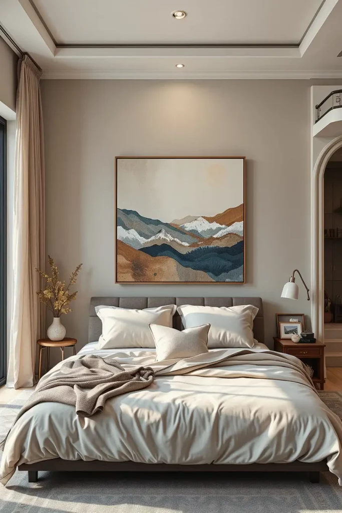 No matter how cozy and luxurious the bedroom is, art is a must, however, it must not overpower. I prefer the low-toned artworks- paintings in such color shades as slate blue, taupe, ochre, terracotta. Abstracts, line drawings, and tone-on-tones are really beautiful in this case. The thought is to uplift the mood and not to ruin it.