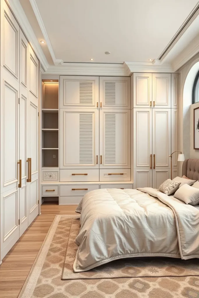 Architectural refinement of a room is available when using custom millwork in a way that it cannot be implemented using readily available furniture. I prefer to have am built-in wardrobe with flush panel, hidden storage or customized wall paneling that serves as art. These facts provide order hierarchy and rhythm, which is a must-have in a calm luxurious atmosphere.