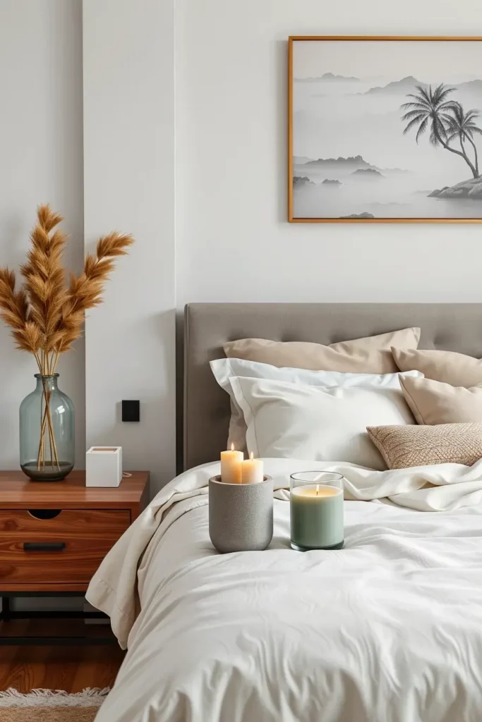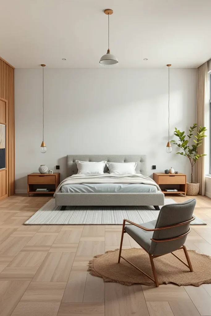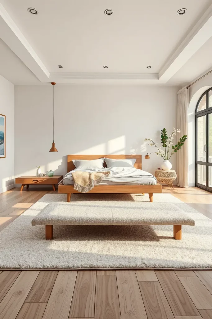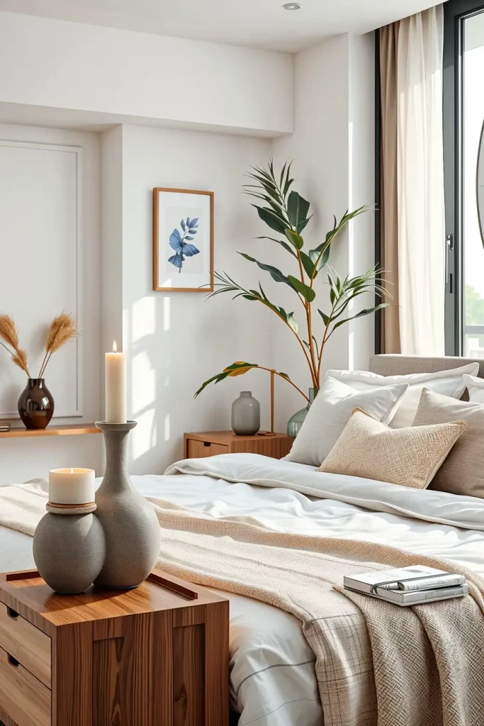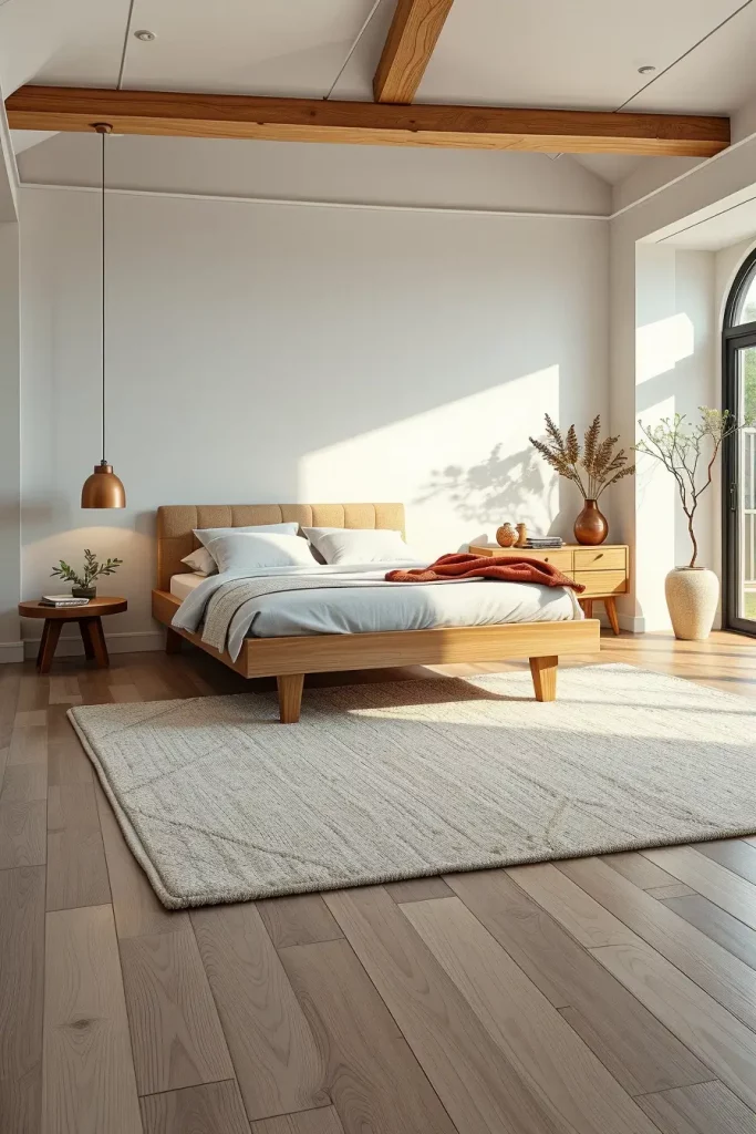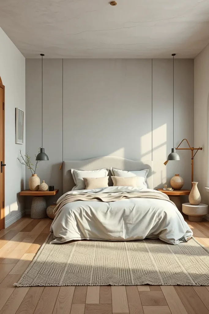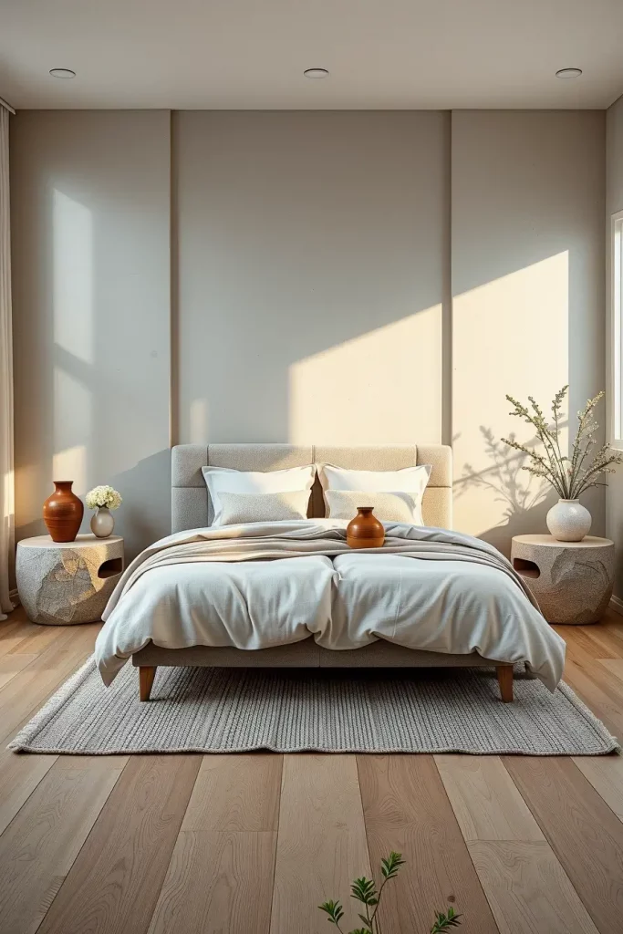 In order to create a more natural environment, I prefer using natural wood flooring and pale shades, but also use furniture that can be partially painted with a matte lacquer or a raw stone finish. An oak or ash platform bed that provides a solid effect, and linen bedding soften the senses with bedside decor that does not scream look at me. The warmth is also provided on a wool area rug underfoot. Unglazed ceramic vases or hand-made bowls of clay are good finishing touches that supplement the natural surfaces across the space.