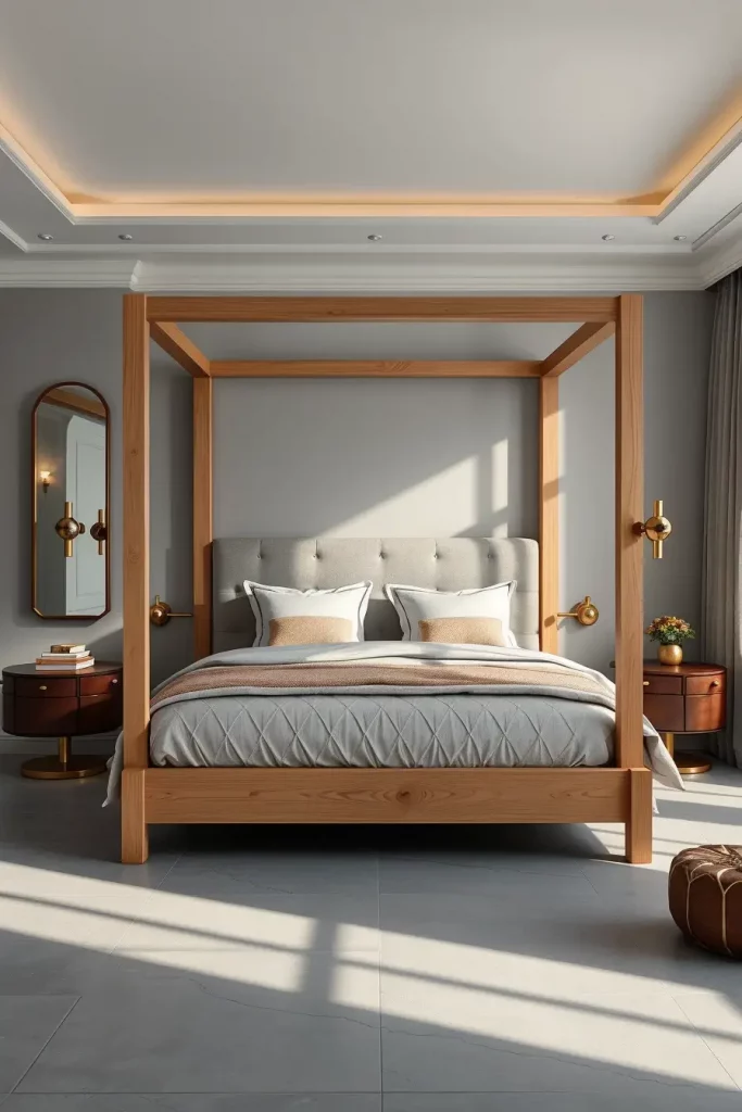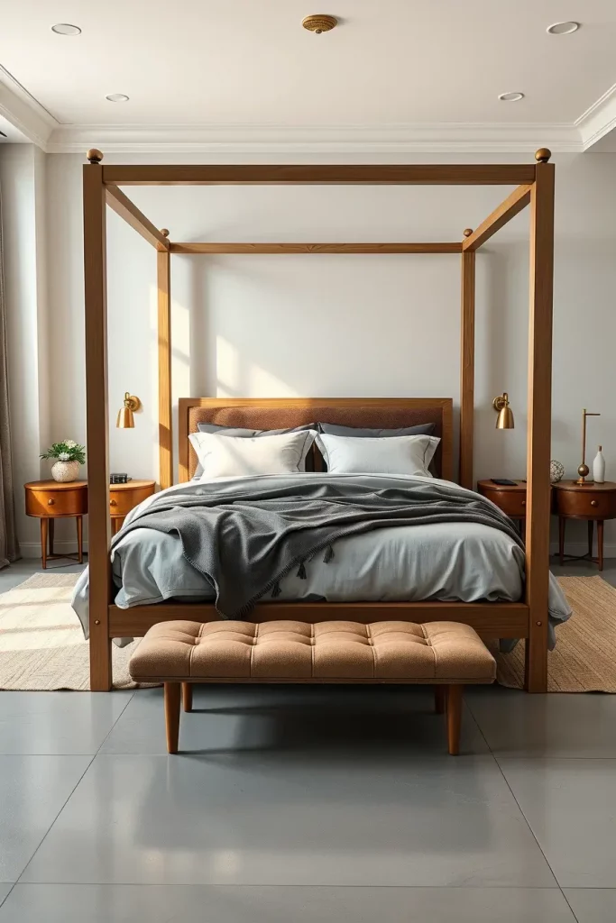 In my most recent pattern, I combined the pale wood frame bed with cream linen bedrooms and matching it with brass reading sconces as well as side tables covered with leather. The straight lines of the canopy provide a grounding, and it looks much like an internal focal element. Matching the furniture scale to the room’s volume is key — too heavy and it feels dated, too light and it loses presence.