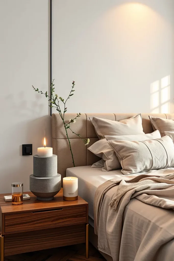 In order to improve this area further, I would introduce a signature scent, through a small minimalistic ceramic diffuser on the nightstand, fragrance is another silent, powerful layer in any luxury interior.