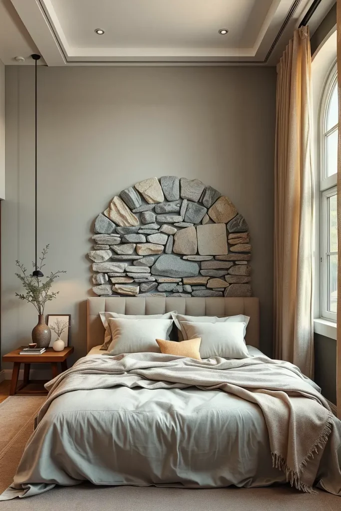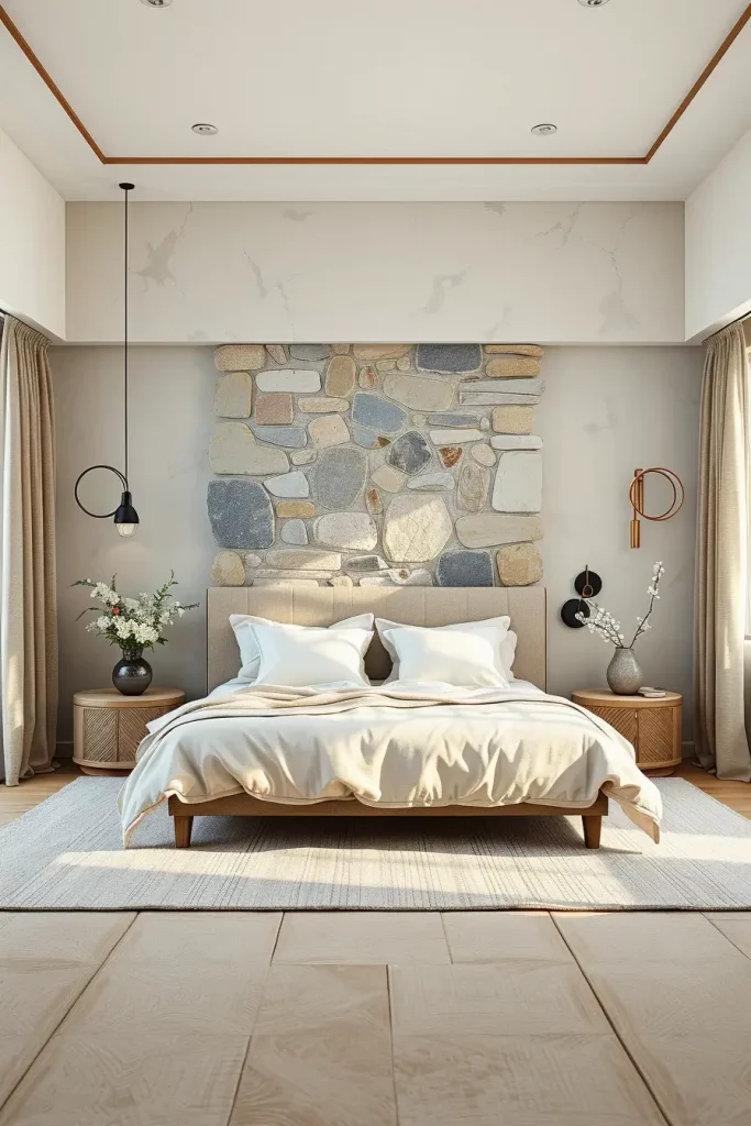 In this favorite project of mine, I put up a limestone slab wall as the backdrop of a headboard. These walls were limewashed in a complementary shade to the other walls and they achieved a smooth transition between cool and warm neutrals. I combined it with flax bedding, the minimum of furniture and brushed bronze accents. The juxtaposition of the uncut rock and smooth plaster gave depth of appearance with a sense of tactile style.