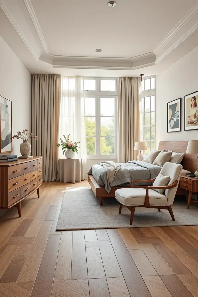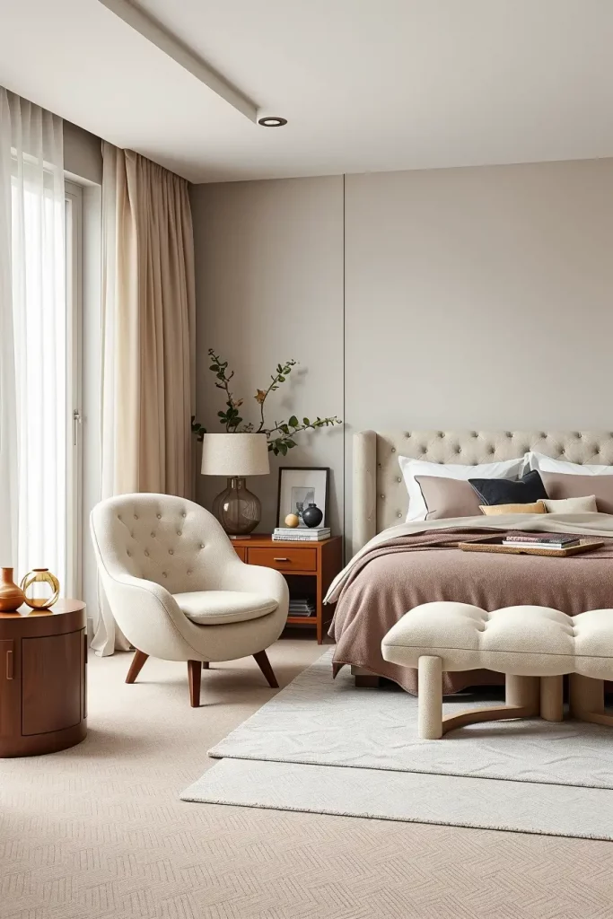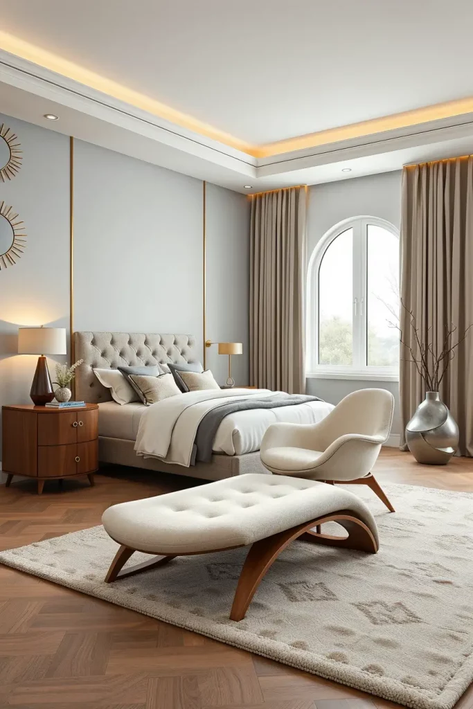 Any quiet luxury bedroom has to have underneath it the classic piece of furnishings- not fashionable pieces. I simply like t-shirts or tops with smooth lines, a few curves, and high-quality materials. Now visualize something mid century wood framed, upholstered in linen armless chairs or a mohair tailored bench. These do not only appear beautiful today but they also age gracefully.