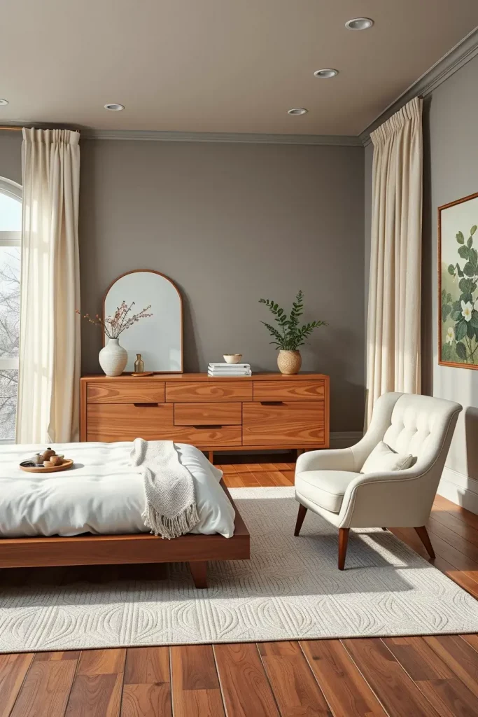 I placed a low walnut platform bed, a mid-century-inspired and natural ash dresser and a curved slipper chair upholstered in ivory boucle in one of my most popular rooms. No, nothing attacked the eye, yet the ensemble and balance seemed to be designed. These are like visual punctuations of these pieces of furniture and they anchor the space in silent fancy.