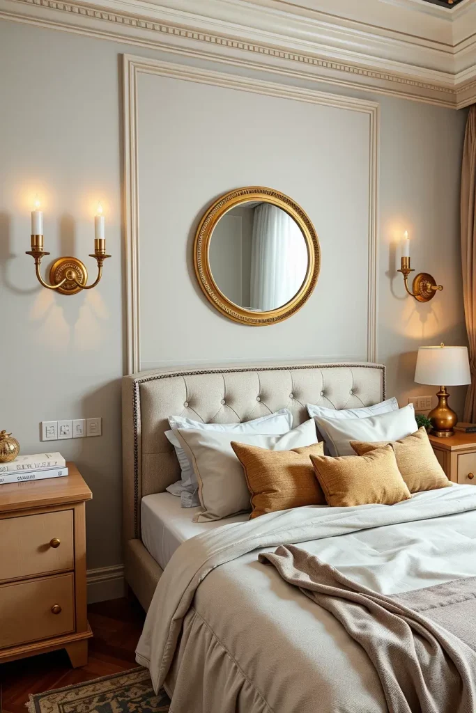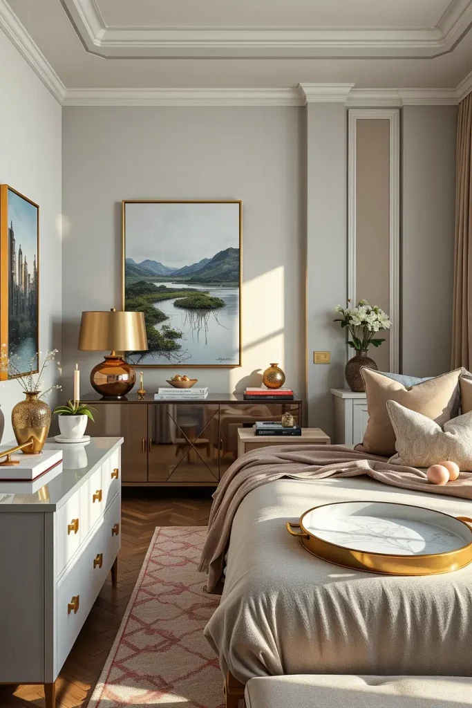 In my most recent bedroom design I used brushed brass sconces above both nightstands, a bronze framed mirror on the dresser, and a drawer pulls finished in a metallic smoky tone. In the night these details would reflect a little luxuriously. I use metal accents very practically as a decor, as light fixtures, on handles, frames of mirrors, etc.