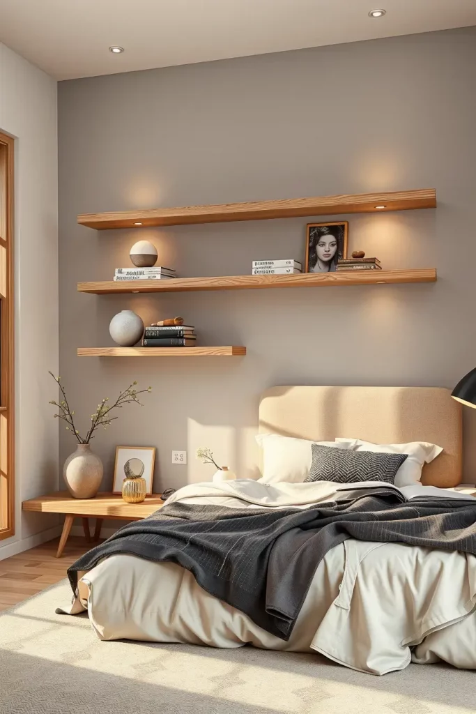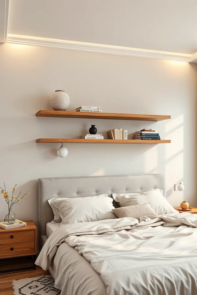 Floating shelves are the perfect solution to style and form without clutering the sight. These shelves ought to be sincere in a subtle luxury bedroom without any excessive or fussy tchotchkes. The shelves I usually take are either of white oak, walnut, or matte black, but it all depends on what the general mood of that room is. They have a slim profile and ensure that the room looks open and sophisticated. The choice of a few hand-selected objects (a sculpture, a small vase, a pile of linen-bound books), based on restraint and discerning eye should be made.