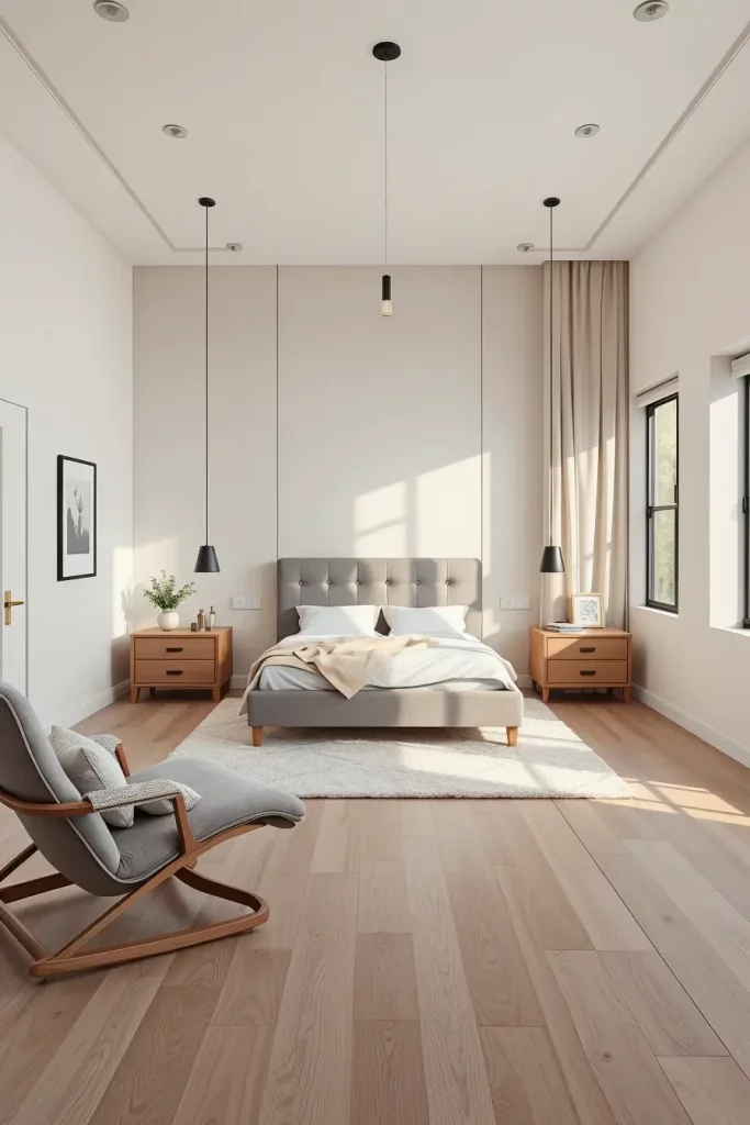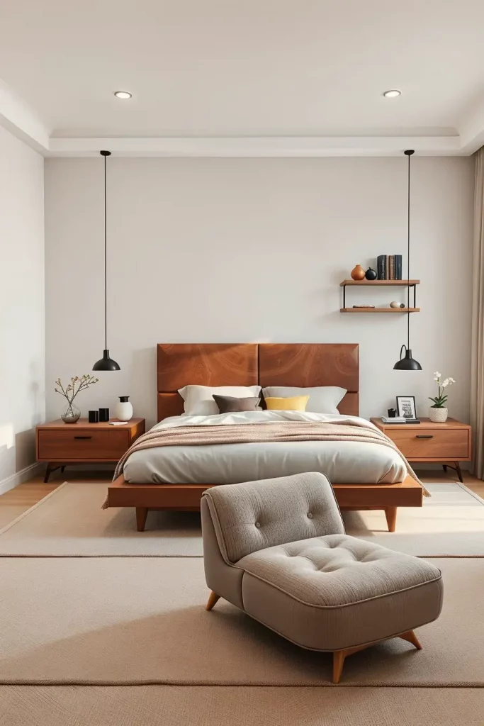 You might only need a low-profile platform bed with a designer nightstand both which are clean line, and one elegant chair. They should tell a lot of stories: think solid wood, wool boucl or natural stone as surface materials. I have been inserting floating shelves where other dressers would have otherwise been because I want to have a flowing theme.