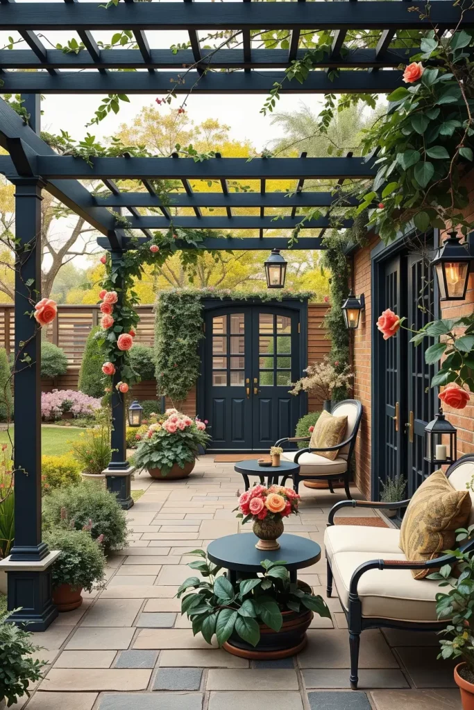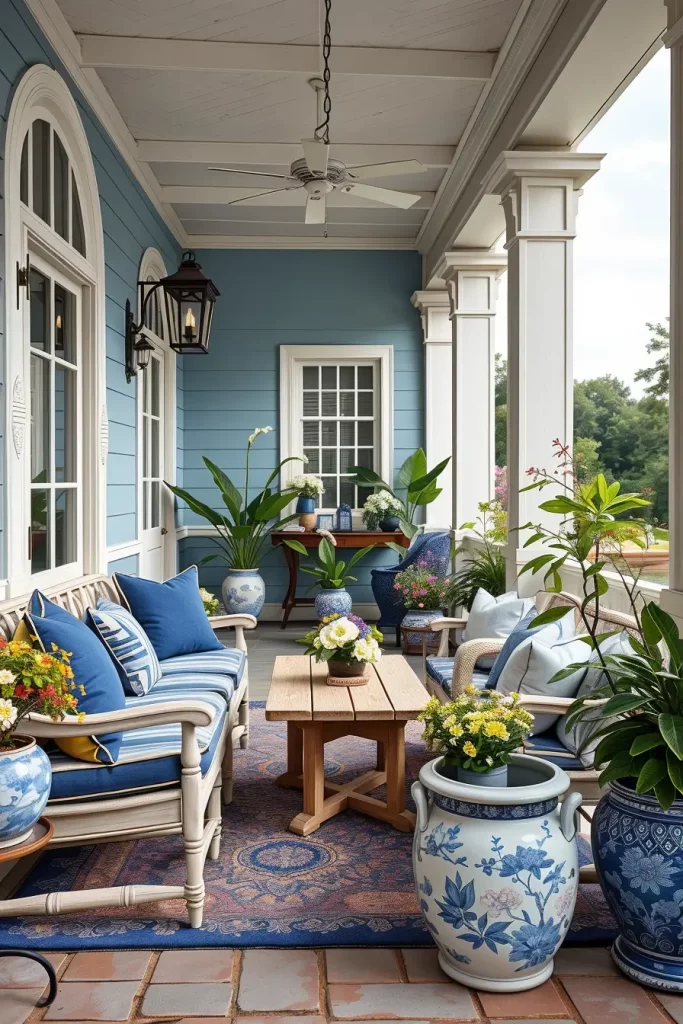 Navy and white striped or floral materials are used to cover benches, throw pillows and umbrellas in the garden. A natural combination is using whitewashed wood or navy wicker furniture in this approach. Ceramic planters and vintage lanterns in cobalt blue will make your space consistent and will draw attention.