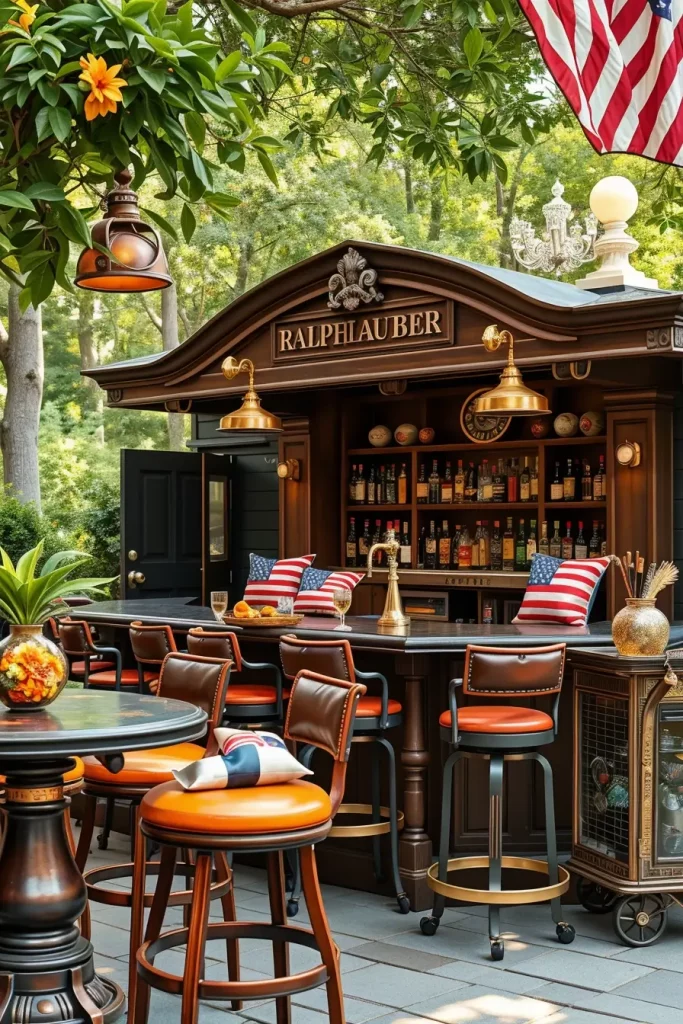 Most of the time, I use dark-stained wood for the bar, linking it with seating that has leather or canvas cushions. Put up a classic drinks cart, signage and rimmed beverage glasses. Things like pillows with American flags and embroidered RL badges add plenty of character.