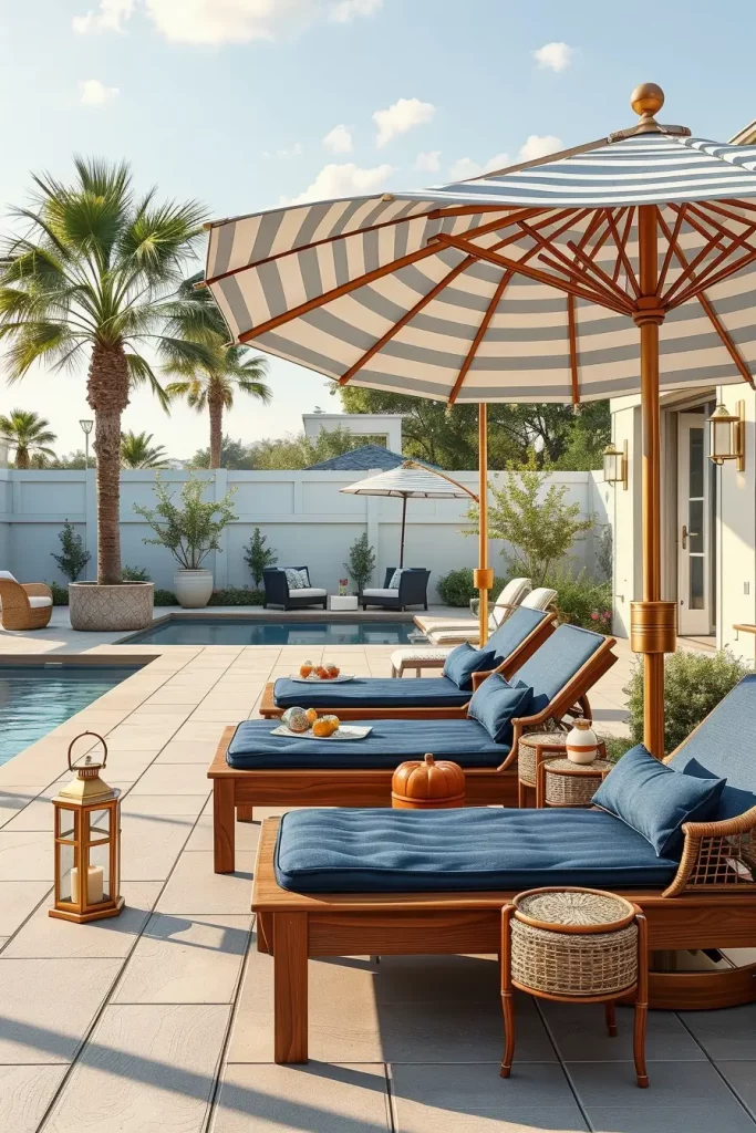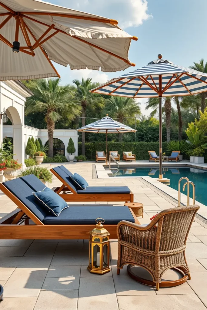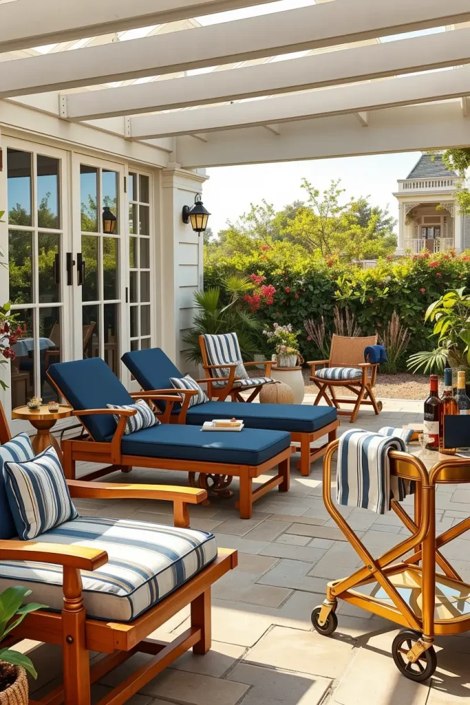 The combination I most like includes navy blue cushioned teak loungers with brass parts, plus grouping director’s chairs and towels with stripes. Having a rolling drink cart and some glass tumblers helps maintain the luxury and avoids the nautical theme.