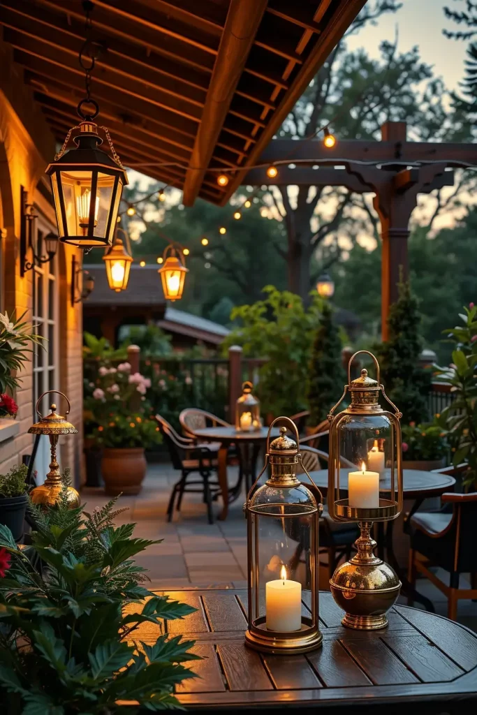 What I often choose is to hang brass lanterns and put hurricane lamps with leather handles on the tables. They go well on dark wooden tables or metal consoles. Small brass trays or singular brass planters keep the room’s sense of continuity.
