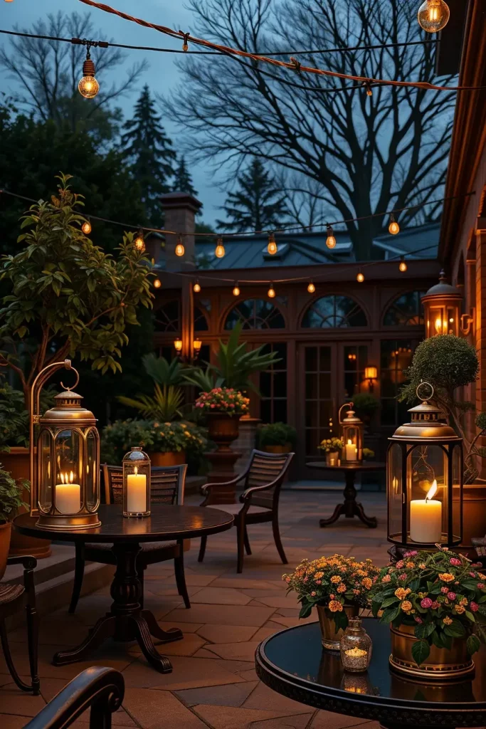 I often put pillar candles in glass hurricanes, set tea lights in cut-crystal holders and hang lanterns from wall brackets or trellises. Details like iron on candelabras or sconces on wooden walls give the space more style. The glowing lights and shiny surfaces make the setting more luxurious.