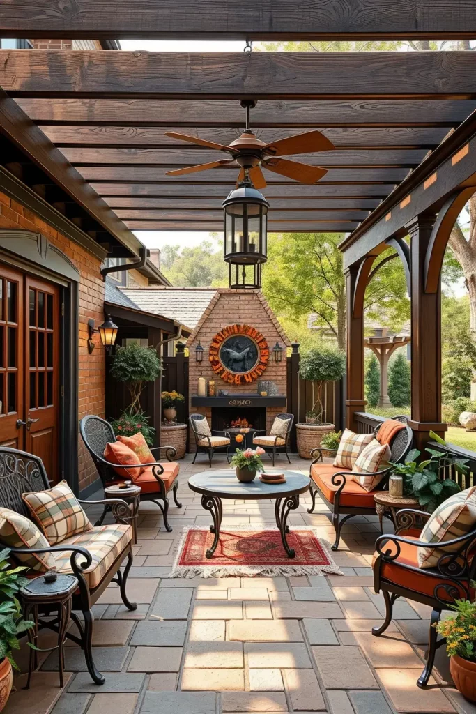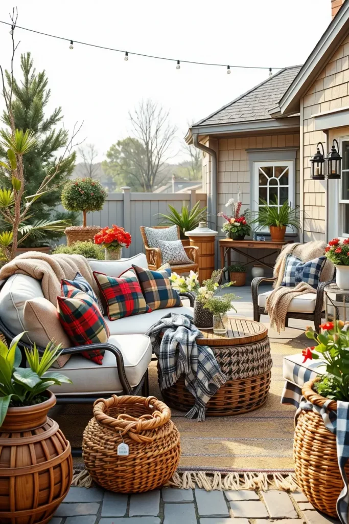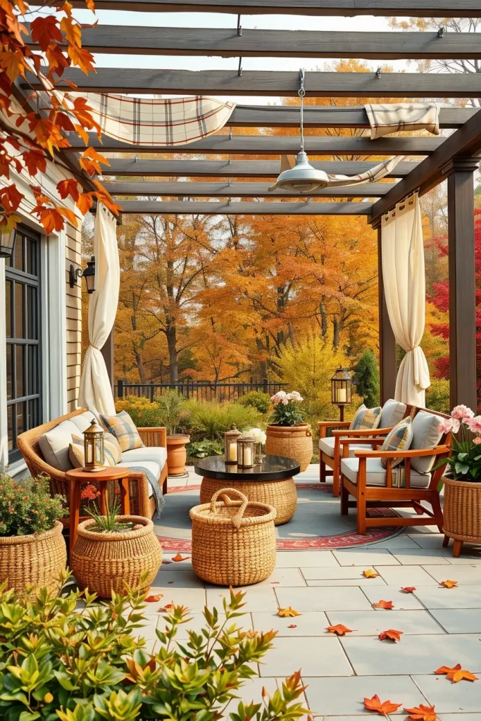 Furniture is always the same, but the choice of accessories has the biggest effect. When the fall season comes, I like decorating with plaid wool throws, oil-rubbed bronze lanterns and saddle leather cushions. Two easy ways to look like an alpine lodge are to hang a canvas pergola and use tartan curtains on a smaller patio.
