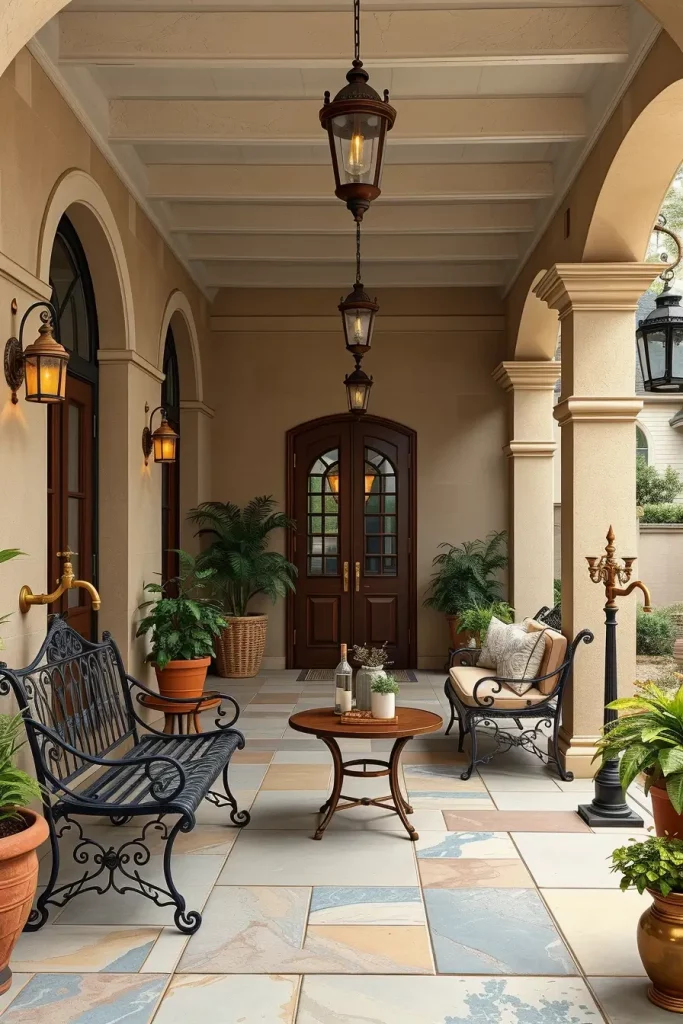 I usually choose forged iron benches, wrought iron candle holders and outdoor faucets with cross handles and weathered finishes. They give the room more personality and help it feel special. Often, the cool design has wooden iron side tables and bronze-framed mirror trays on them for choosing cocktails.