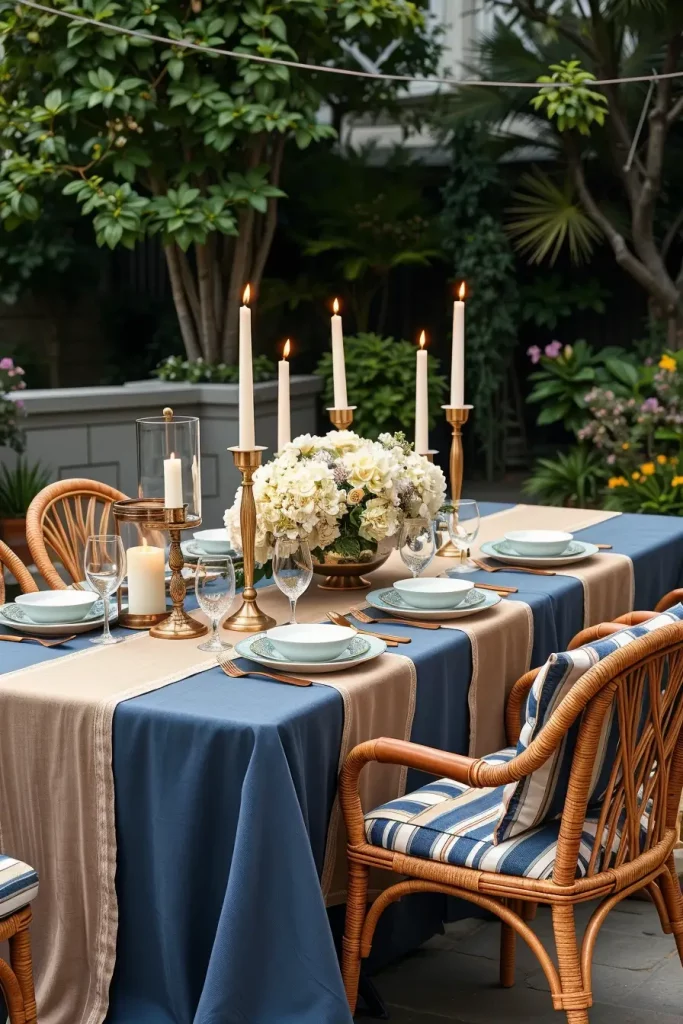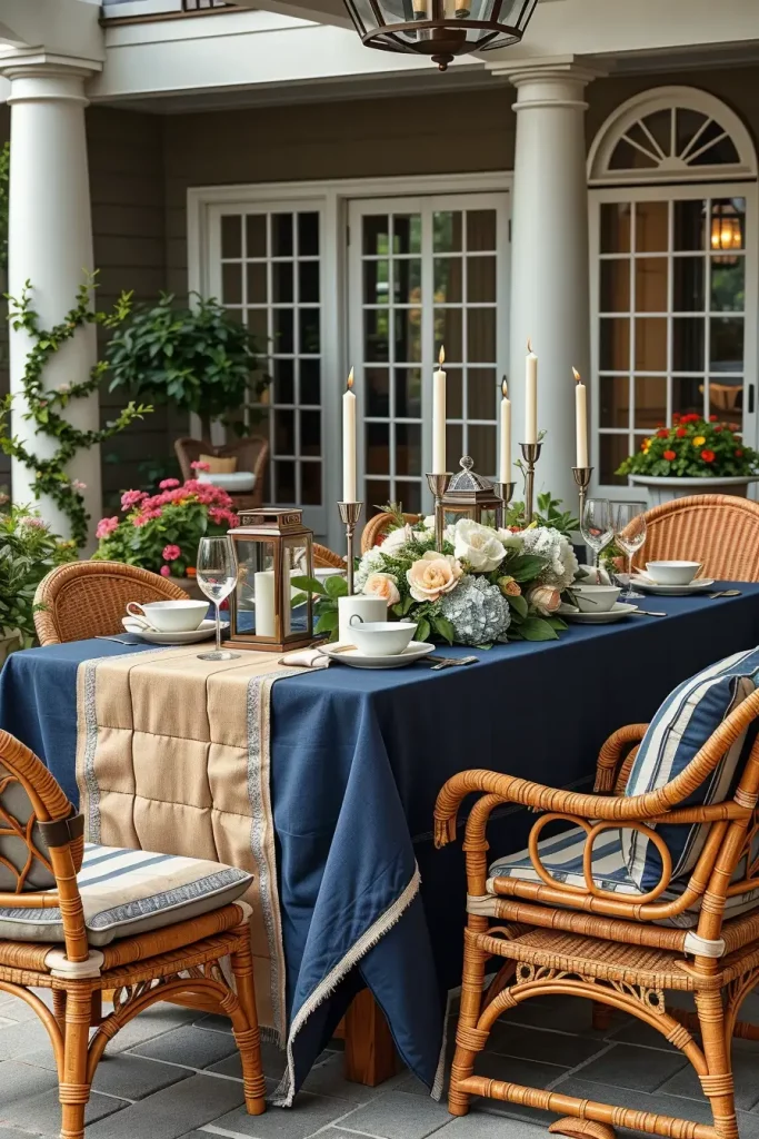 I usually display hurricane lanterns, silver tall candleholders and a centerpiece of hydrangeas during summer or pine branches when it’s fall time. Mid-century or rattan chairs with navy-striped pillows suit the traditional setting and are easy for the patio. To make things look nicer, add cloth napkins with Monograms from Ralph Lauren or leather napkin rings that reference his legacy.