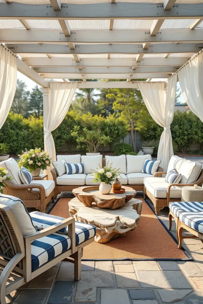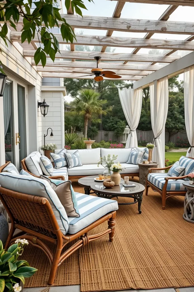 A white sectional that’s blue-trimmed and accompanied by blue-and-white striped loungers defines the space. Putting a driftwood coffee table with coastal books and shells in glass cases is my usual addition. When a pergola has soft white curtains, it gives the whole area a resortlike feeling.