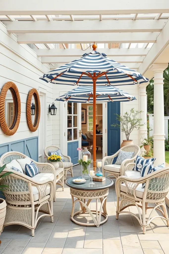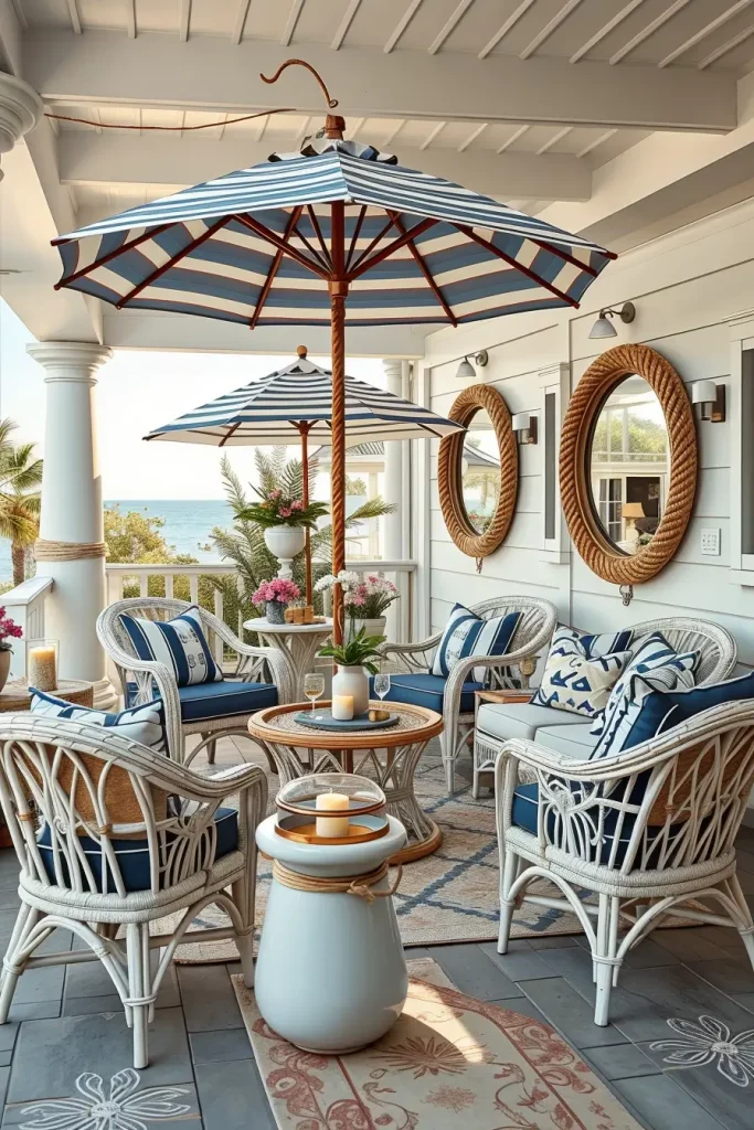 I love putting up low-slung chairs made of white rattan, a rug in sand color and a navy-and-white cabana pattern umbrella. Things like rope-framed mirrors and glass hurricane candle holders suggest the seaside without making the space look like a theme.
