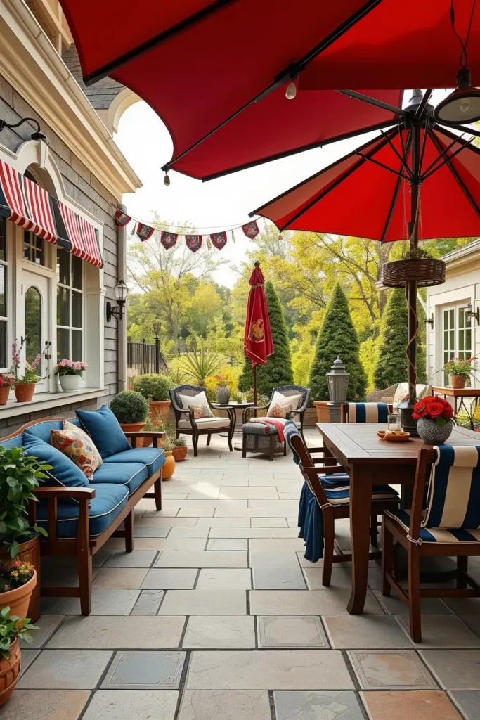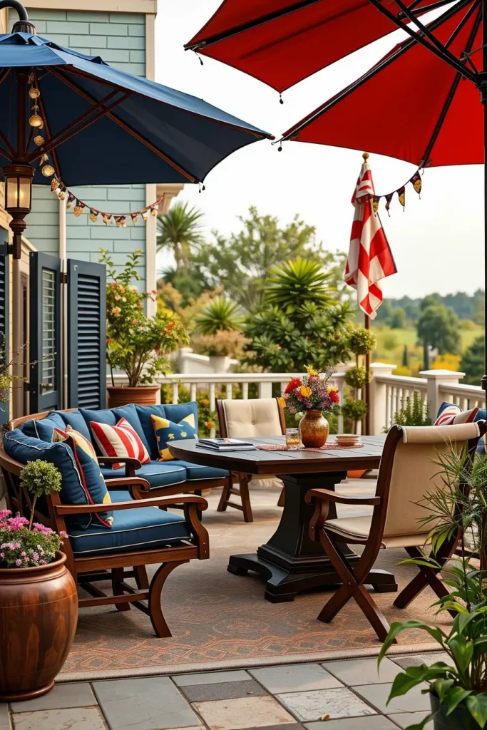 I prefer to have boxy seating outside in navy canvas with a white piping detail. A dark wood dining table and canvas sling chairs are nice and finishing the look with striped banners or pictures in UV-safe frames is ideal. The outfit is completed with a navy and red umbrella.