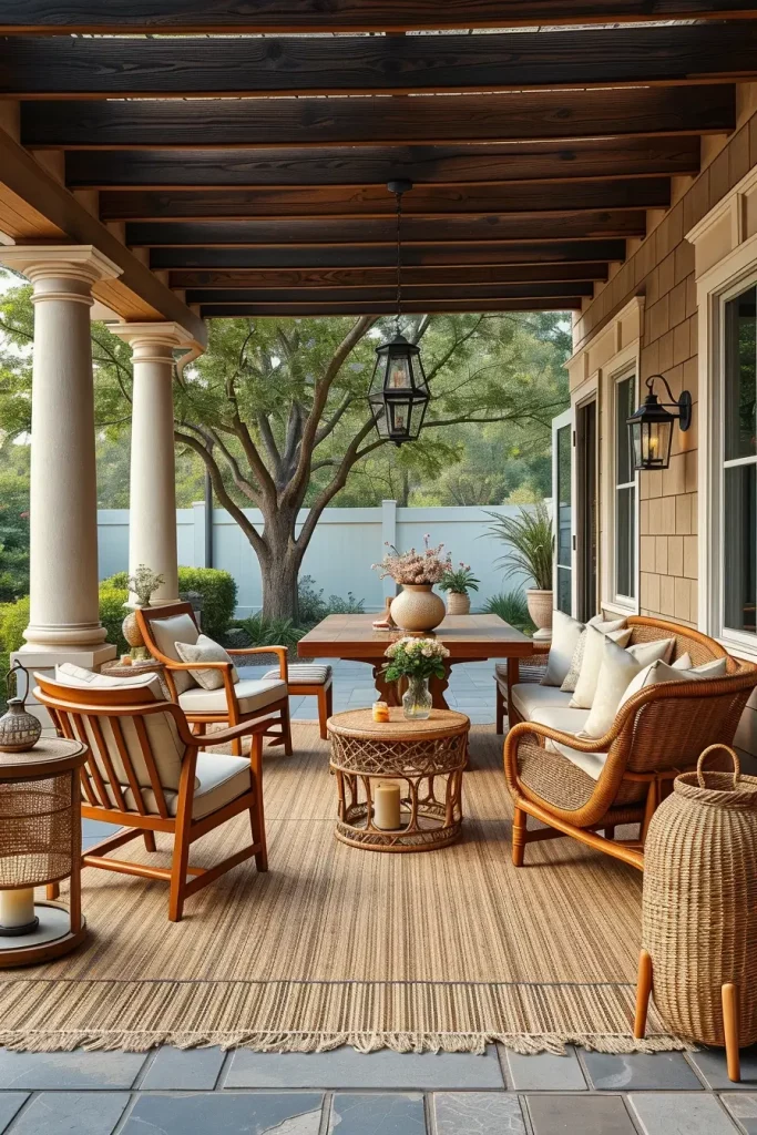 In this case, I choose to put together jute rugs, teak lounge chairs, wicker side tables and woven lanterns. Put down linen or cotton cushions in soft neutrals as a finishing touch. An oak dining table that is slightly worn and rattan chairs keep the overall setup tactile. All the different kinds of materials bring a cozy and nicely crafted atmosphere.