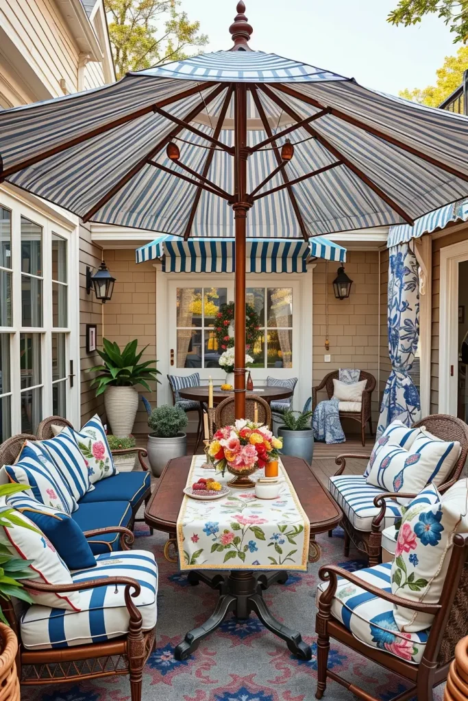 The look of summer can’t be beat by a Ralph Lauren-decorated cabana-striped umbrella. These pieces are usually the center of attention for the patio. Just adding stripes in navy and cream or hunter green and white can make any outdoor setting look more refined.