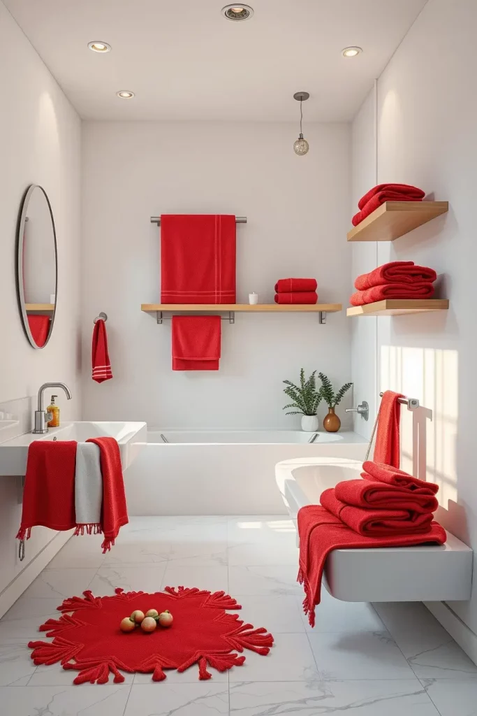 I adore using the layed towel sets in differing colors such as cherry, burgundy and coral. These give dimension and softness. You may combine them with a red bath mat or a patterned shower curtain with red to set the style. To achieve a spa-like look I place hand towels and bath sheets on floating shelves or hang them up on fashionable bars or hooks. Small strength of the theme is reinforced by a red linen hamper or even by red-trimmed washcloths.