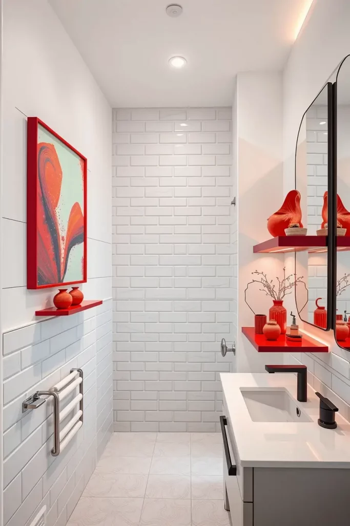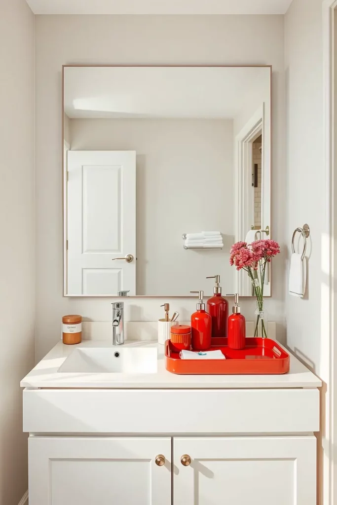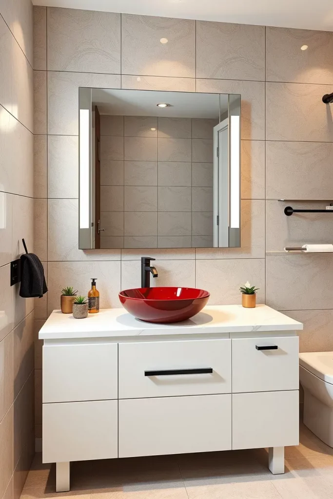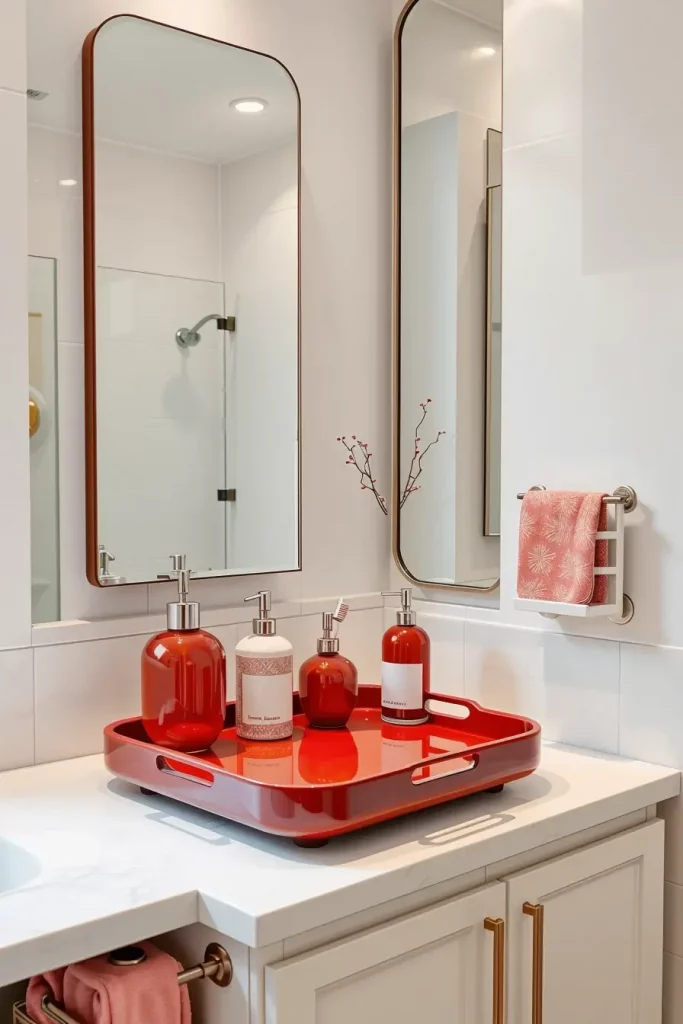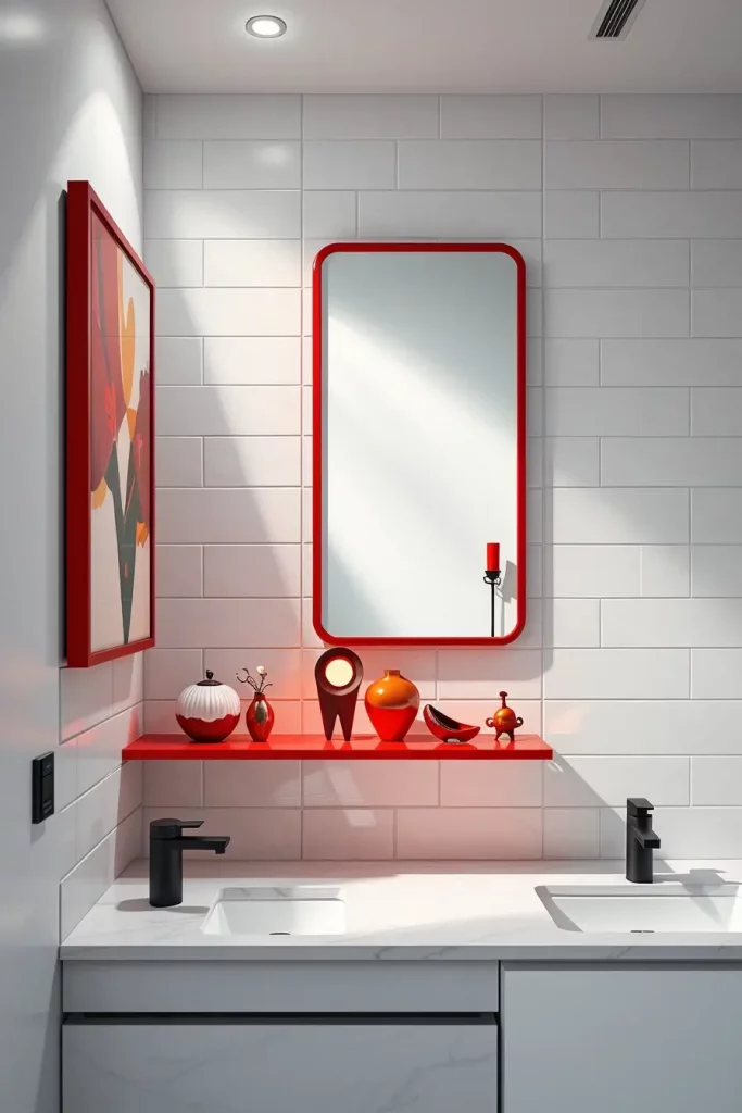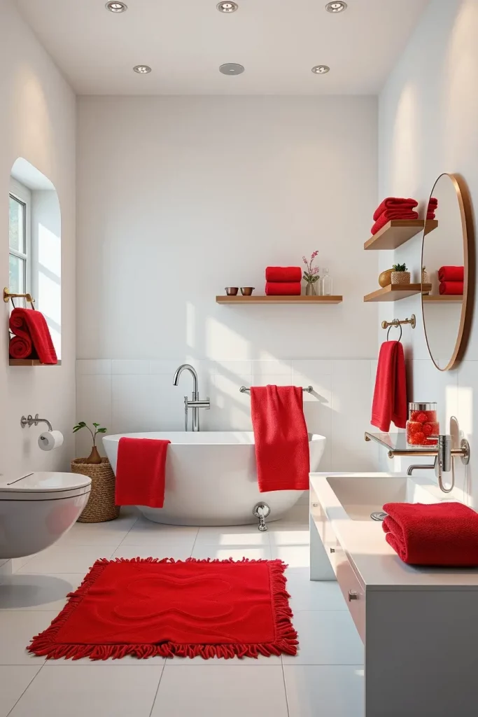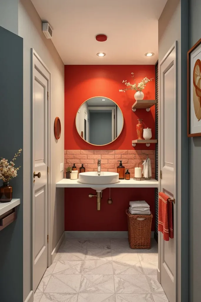 Small decorative details are one of the most pleasant ways to introduce red: a soap dispenser, a red vase on the vanity or a stylish wall print. The items are a taste of personalisation without an undoable commitment. A face in a mirror with red frames or a picture of deep red that can just make the whole look so well-defined and it is otherwise an empty wall that can be given a purpose of design. This would be ideal especially in rentals or rooms that you don not want to have fixed over time.
