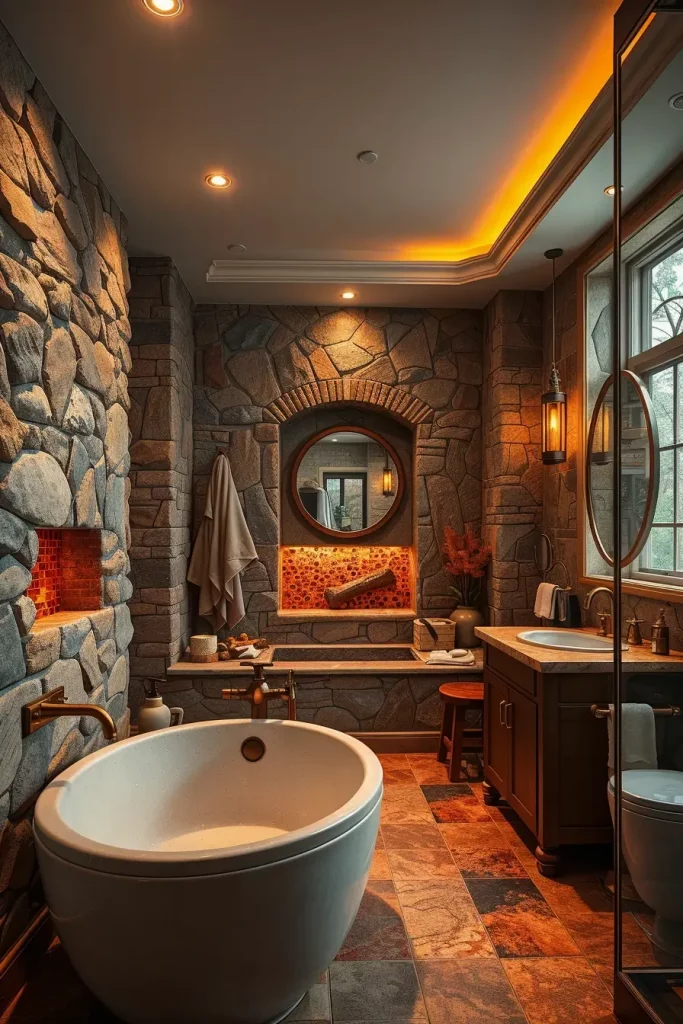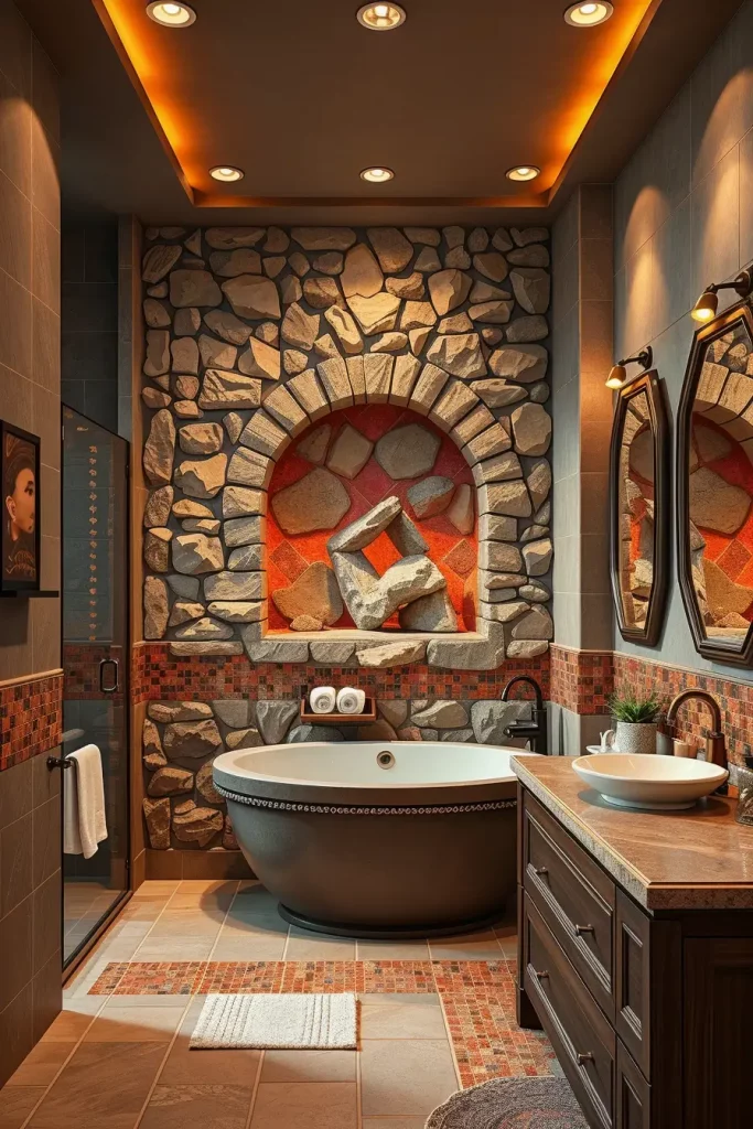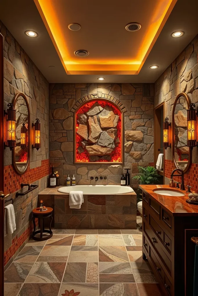 My preferred material regarding this is red travertine or natural stone veneer having burnt red and rust hues. I tend to put some recessed warmed LEDs on the wall simulating the flickering firelight. With a combination of natural wood vanities, bronze fixtures, as well as warm toned lighting, the room turns into a serene oasis. I also prefer to combine this style with puny textures plush red towels, some deep-colored floor rug or wood-slat mats.